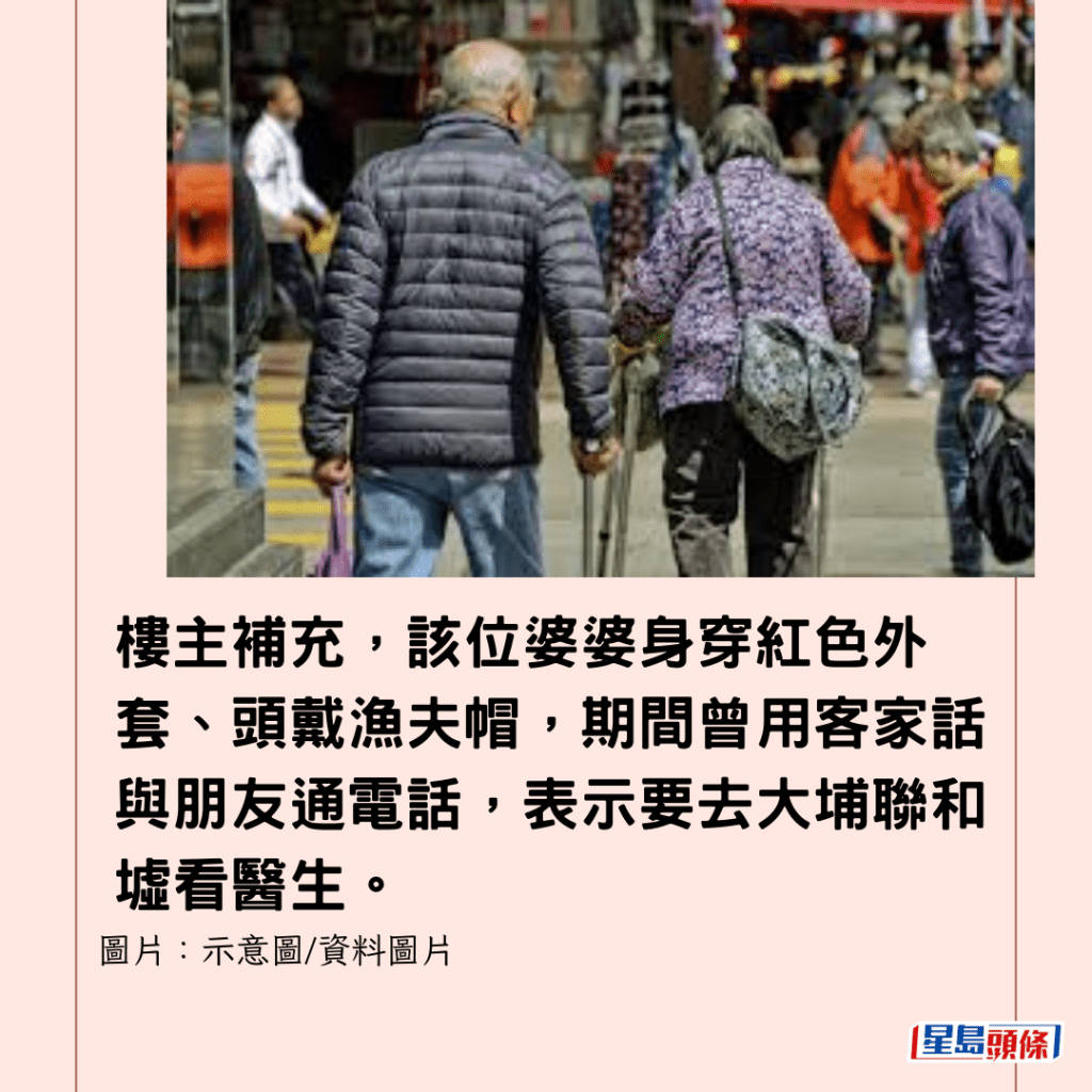 樓主補充,該位婆婆身穿紅色外套、頭戴漁夫帽,期間曾用客家話與朋友通電話,表示要去大埔聯和墟看醫生。他坦言,將事件分享出來,「都係想佢屋企人自己睇到」,提醒大家多關心家中長者。