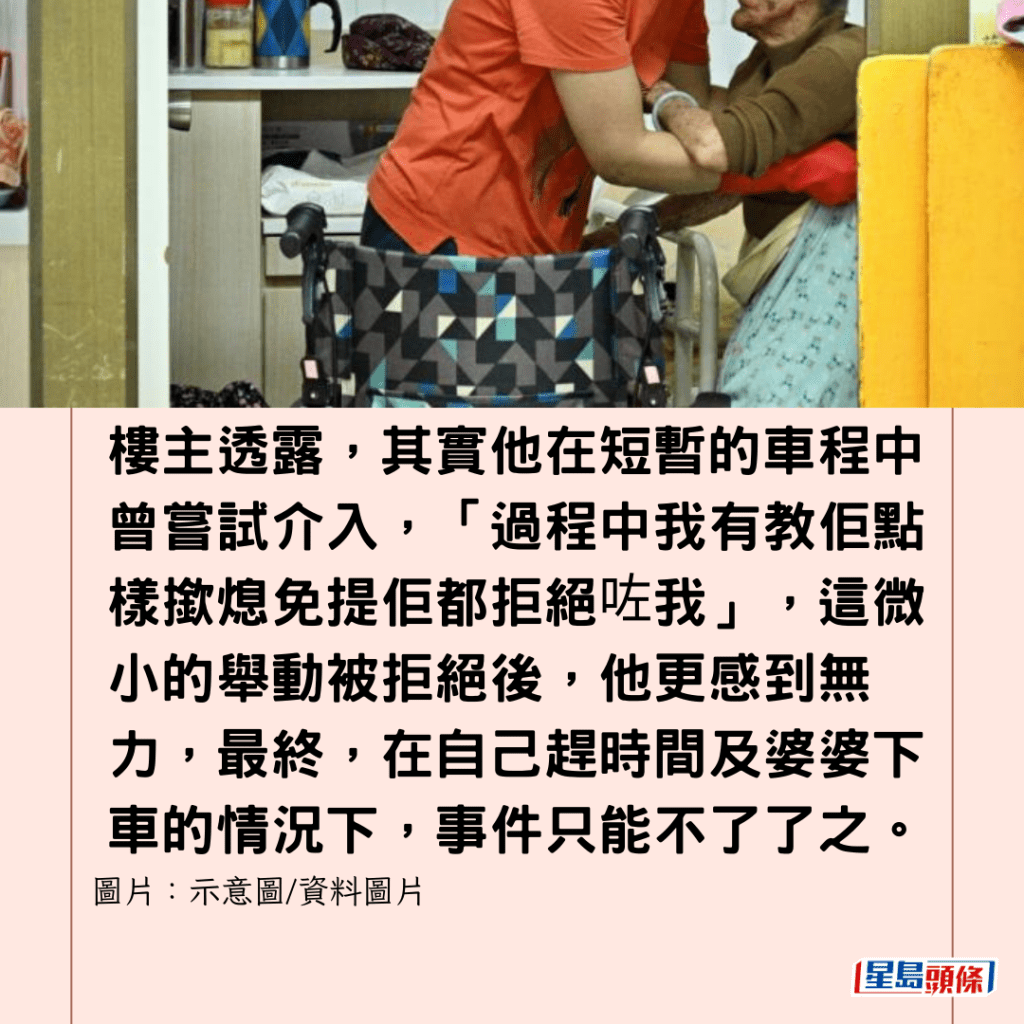 樓主透露,其實他在短暫的車程中曾嘗試介入,「過程中我有教佢點樣撳熄免提佢都拒絕咗我」,這微小的舉動被拒絕後,他更感到無力,最終,在自己趕時間及婆婆下車的情況下,事件只能不了了之。