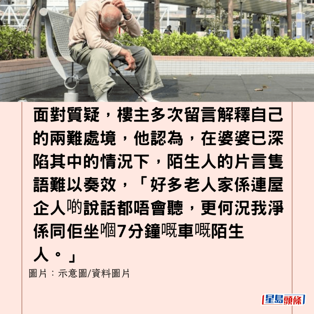 面對質疑,樓主多次留言解釋自己的兩難處境,他認為,在婆婆已深陷其中的情況下,陌生人的片言隻語難以奏效,「好多老人家係連屋企人啲說話都唔會聽,更何況我淨係同佢坐嗰7分鐘嘅車嘅陌生人。」