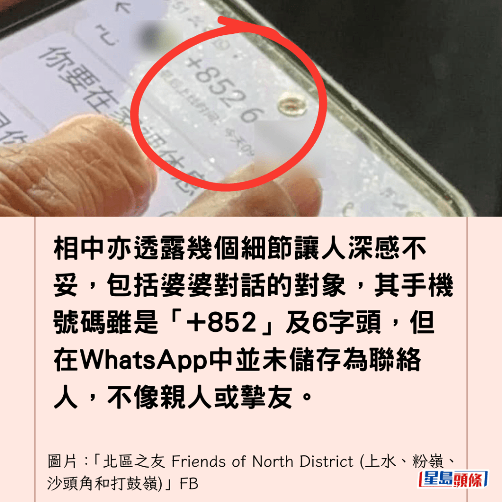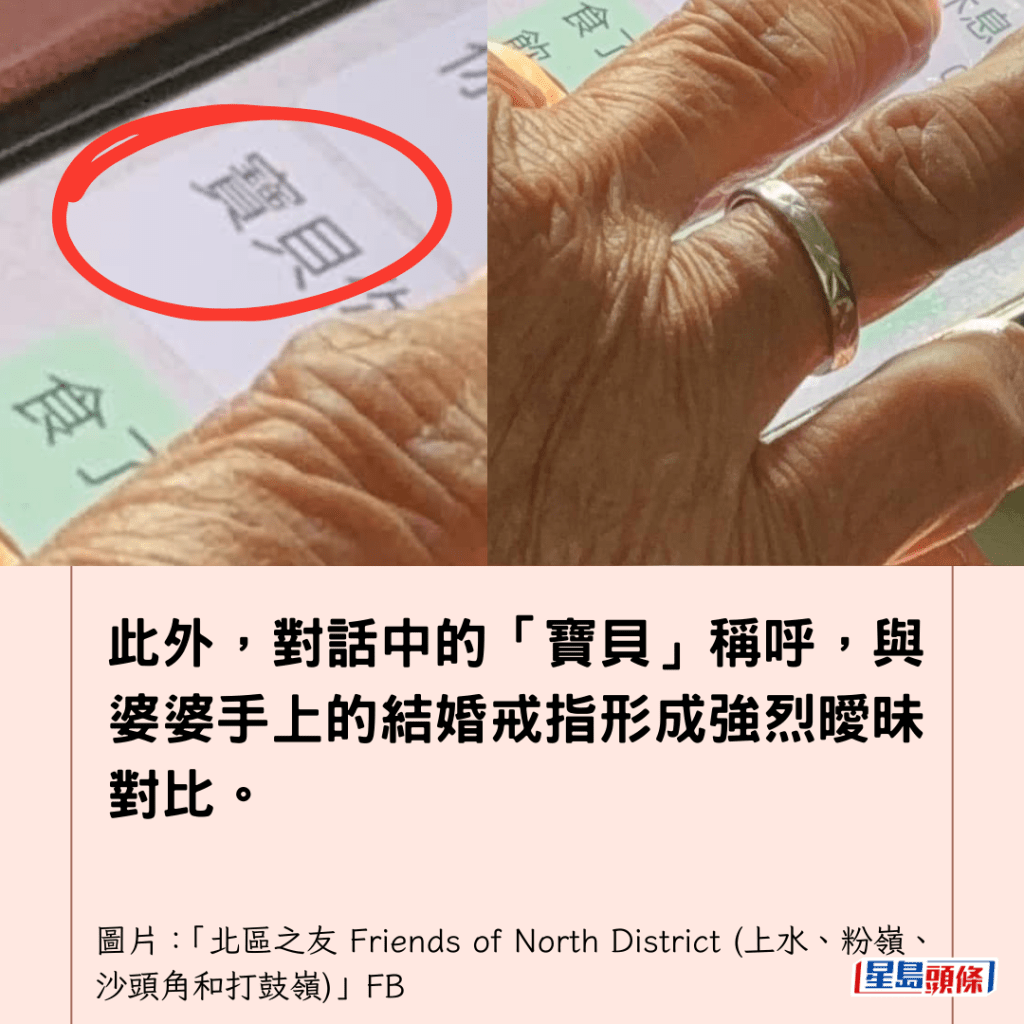 相中亦透露幾個細節讓人深感不妥,包括婆婆對話的對象,其手機號碼雖是「+852」及6字頭,但在WhatsApp中並未儲存為聯絡人,不像親人或摯友。此外,對話中的「寶貝」稱呼,與婆婆手上的結婚戒指形成強烈曖昧對比。