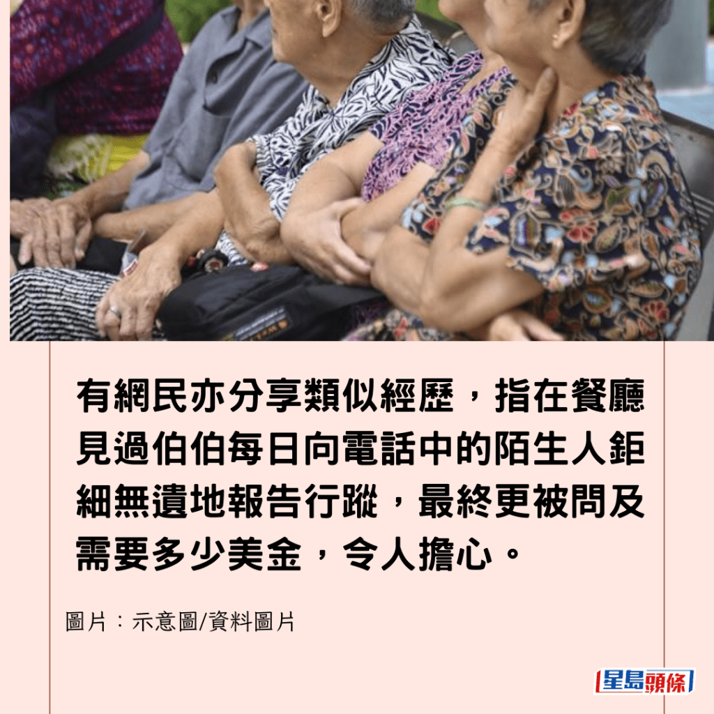 有網民亦分享類似經歷,指在餐廳見過伯伯每日向電話中的陌生人鉅細無遺地報告行蹤,最終更被問及需要多少美金,令人擔心。
