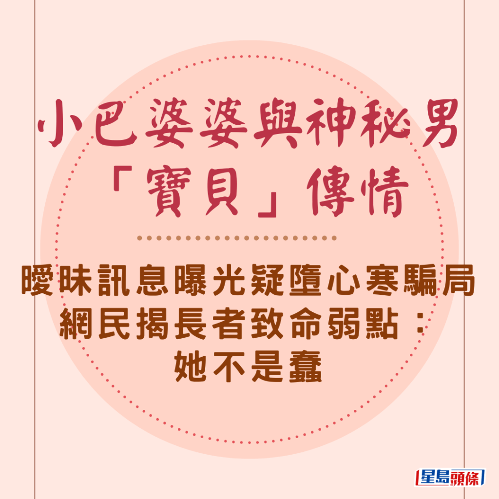 小巴婆婆與神秘男「寶貝」傳情 曖昧訊息曝光疑墮心寒騙局 網民揭長者致命弱點:她不是蠢↓↓↓↓