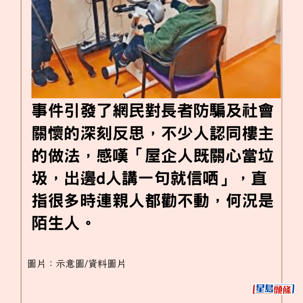 事件引發了網民對長者防騙及社會關懷的深刻反思,不少人認同樓主的做法,感嘆「屋企人既關心當垃圾,出邊d人講一句就信哂」,直指很多時連親人都勸不動,何況是陌生人。