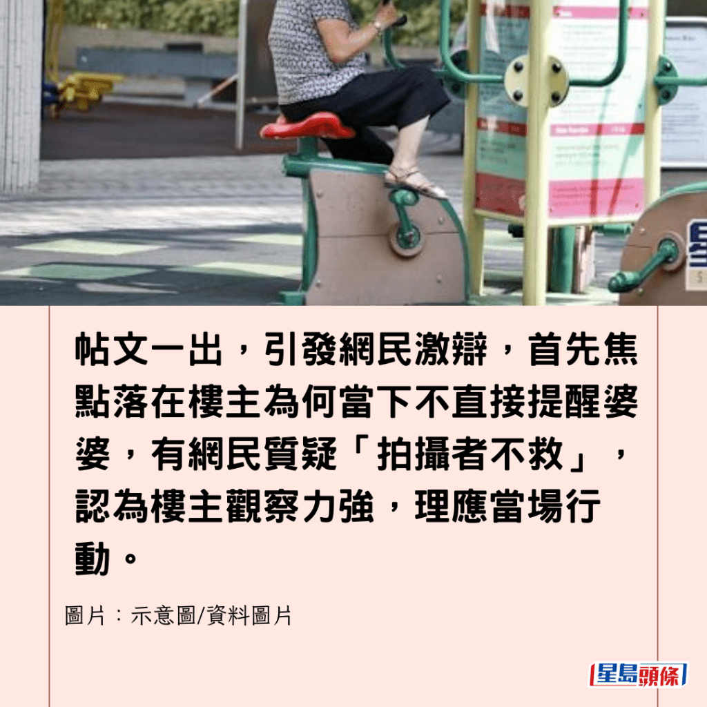 帖文一出,引發網民激辯,首先焦點落在樓主為何當下不直接提醒婆婆,有網民質疑「拍攝者不救」,認為樓主觀察力強,理應當場行動。