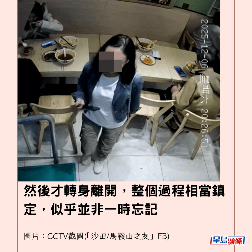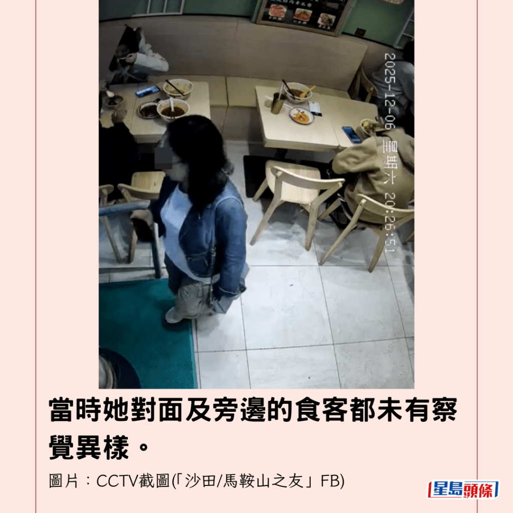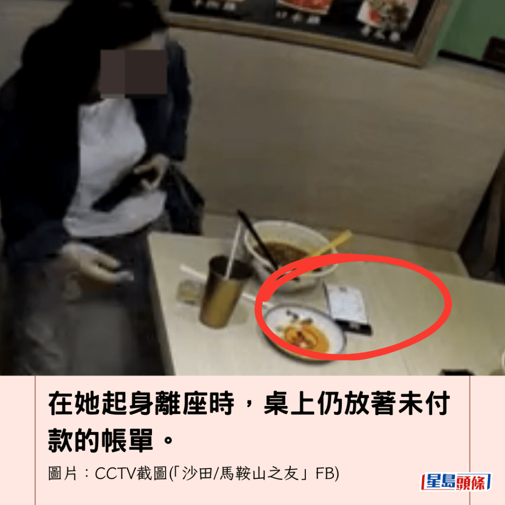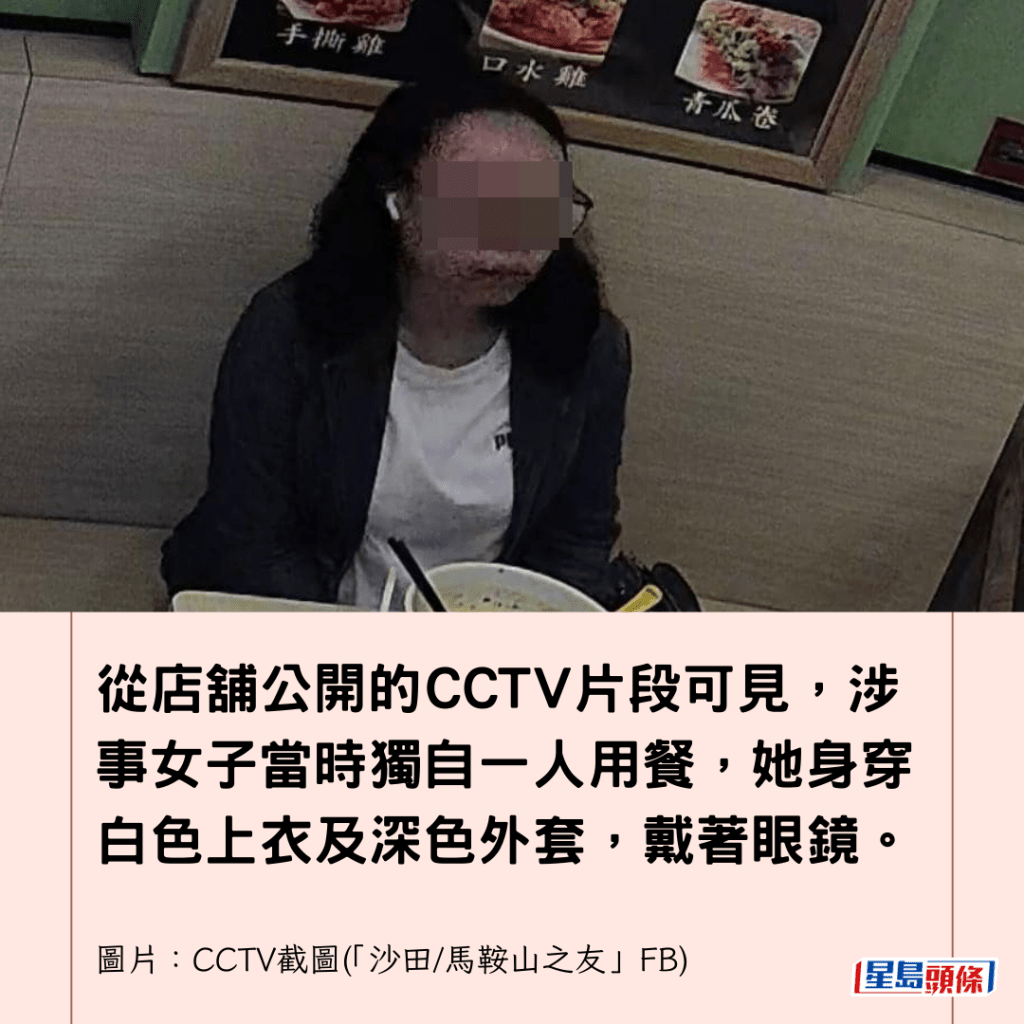 從店舖公開的CCTV片段可見,涉事女子當時獨自一人用餐,她身穿白色上衣及深色外套,戴著眼鏡。
