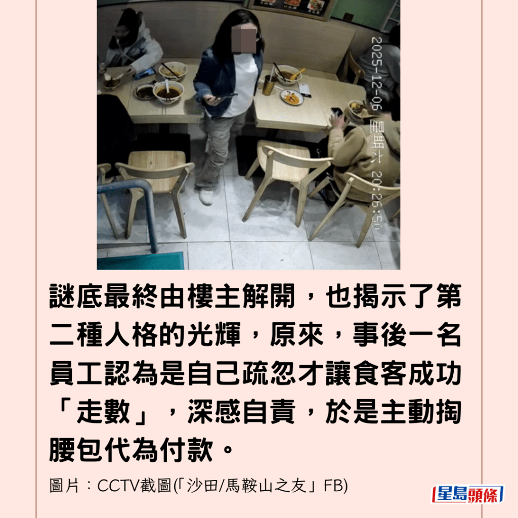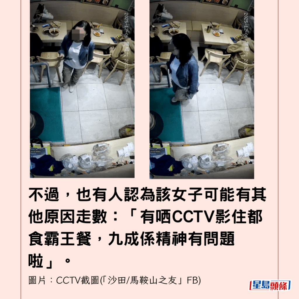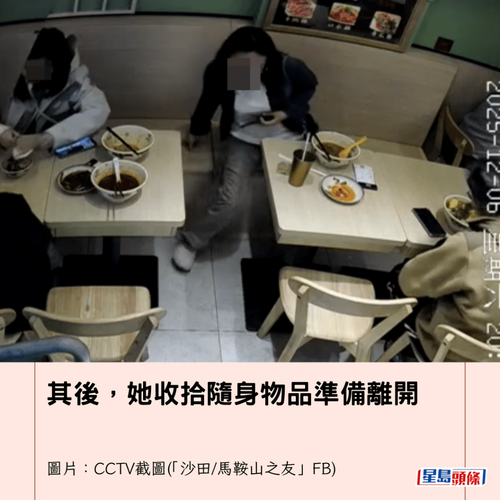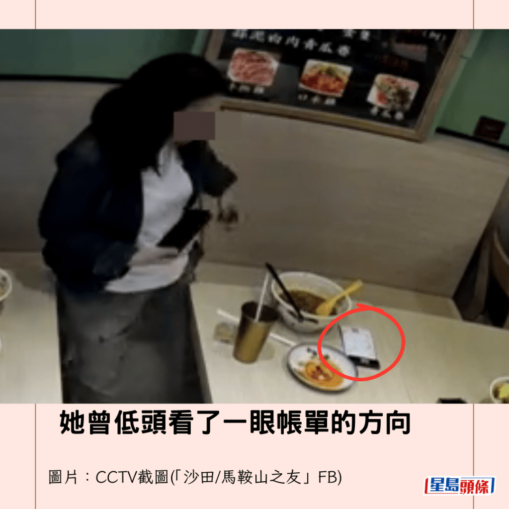 從店舖公開的CCTV片段可見,涉事女子當時獨自一人用餐,她身穿白色上衣及深色外套,戴著眼鏡。