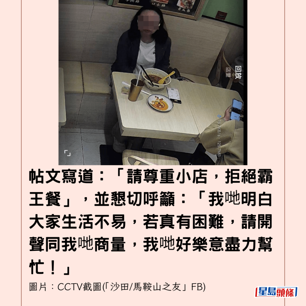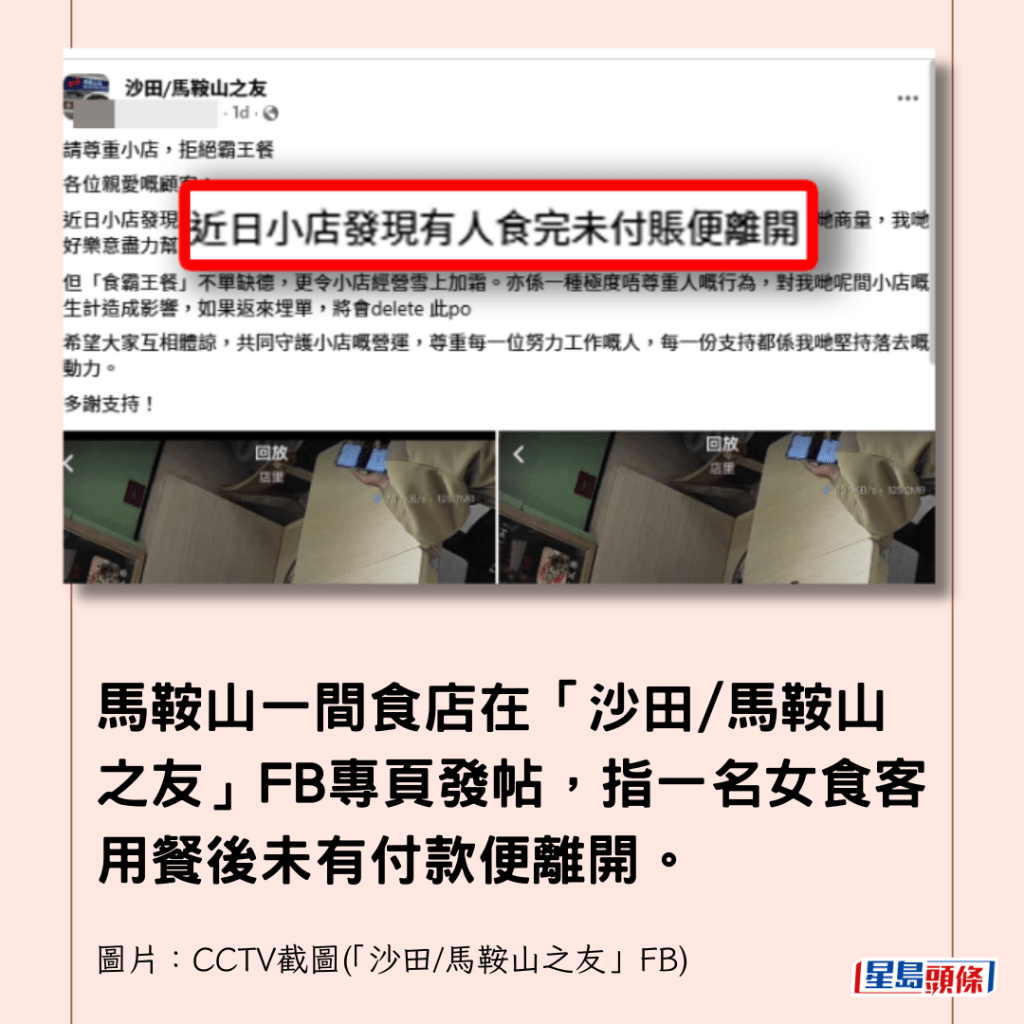 馬鞍山一間食店近日在「沙田/馬鞍山之友」FB專頁發帖,指一名女食客用餐後未有付款便離開。帖文寫道:「請尊重小店,拒絕霸王餐」,並懇切呼籲:「我哋明白大家生活不易,若真有困難,請開聲同我哋商量,我哋好樂意盡力幫忙!」