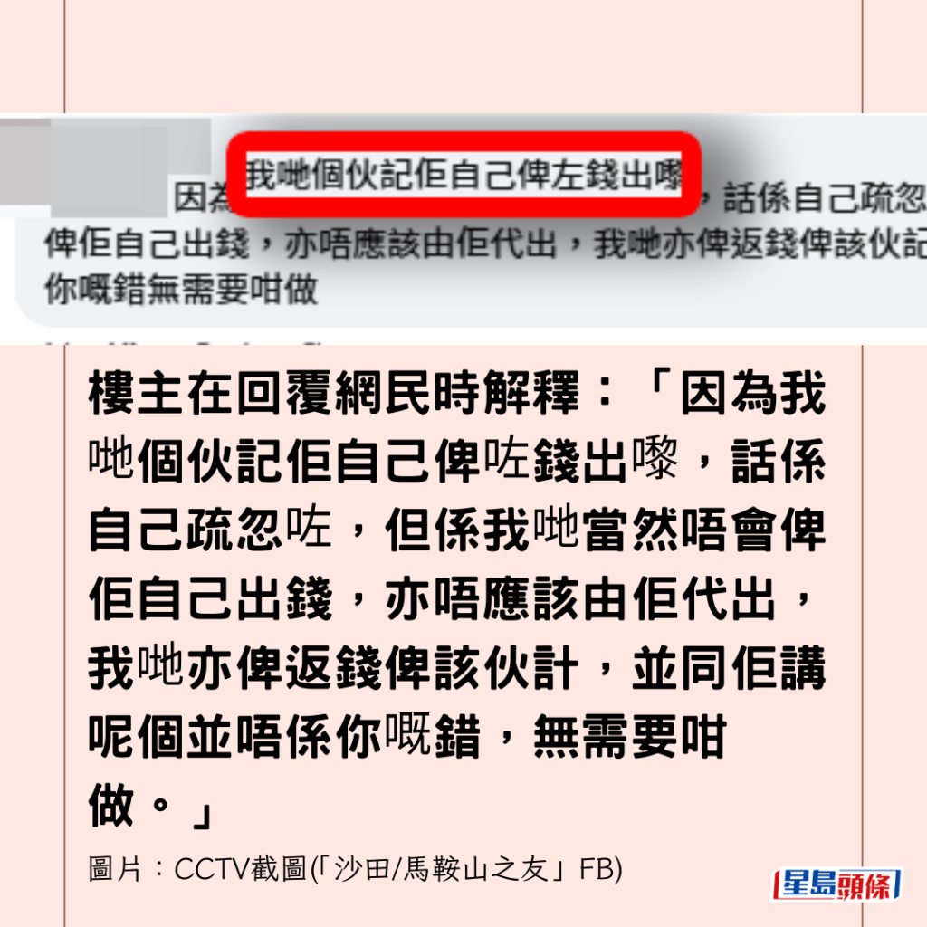 樓主在回覆網民時解釋:「因為我哋個伙記佢自己俾咗錢出嚟,話係自己疏忽咗,但係我哋當然唔會俾佢自己出錢,亦唔應該由佢代出,我哋亦俾返錢俾該伙計,並同佢講呢個並唔係你嘅錯,無需要咁做。」
