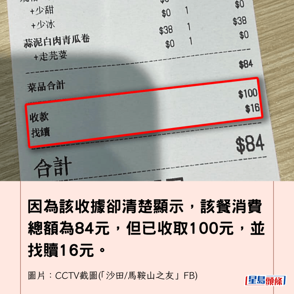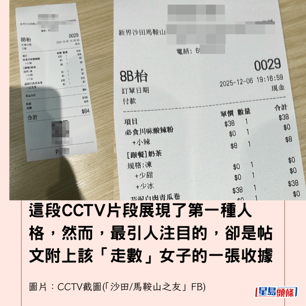 這段CCTV片段展現了第一種人格,然而,最引人注目的,卻是帖文附上該「走數」女子的一張收據,因為該收據卻清楚顯示,該餐消費總額為84元,但已收取100元,並找贖16元。