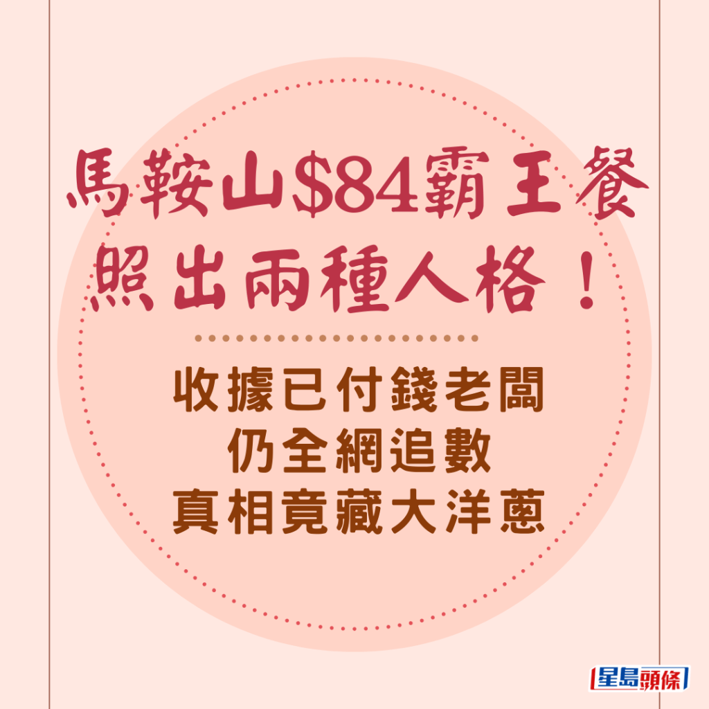 馬鞍山一間食店在網上發文,追緝一名食$84元「霸王餐」的女食客,不過,最離奇的是,店主在帖文中附上了一張顯示「已付款」的收據,掀起網民熱議:為何付了錢仍要全網追數?隨著樓主和網民的對話曝光,事件真相揭開,不僅照出了人性的兩個極端,結局更藏著令人動容的「大洋蔥」。