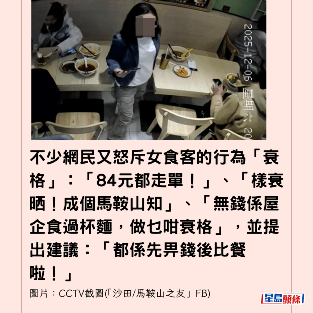 不少網民又怒斥女食客的行為「衰格」:「84元都走單!」、「樣衰晒!成個馬鞍山知」、「無錢係屋企食過杯麵,做乜咁衰格」,並提出建議:「都係先畀錢後比餐啦!」不過,也有人認為該女子可能有其他原因走數:「有哂CCTV影住都食霸王餐,九成係精神有問題啦」。