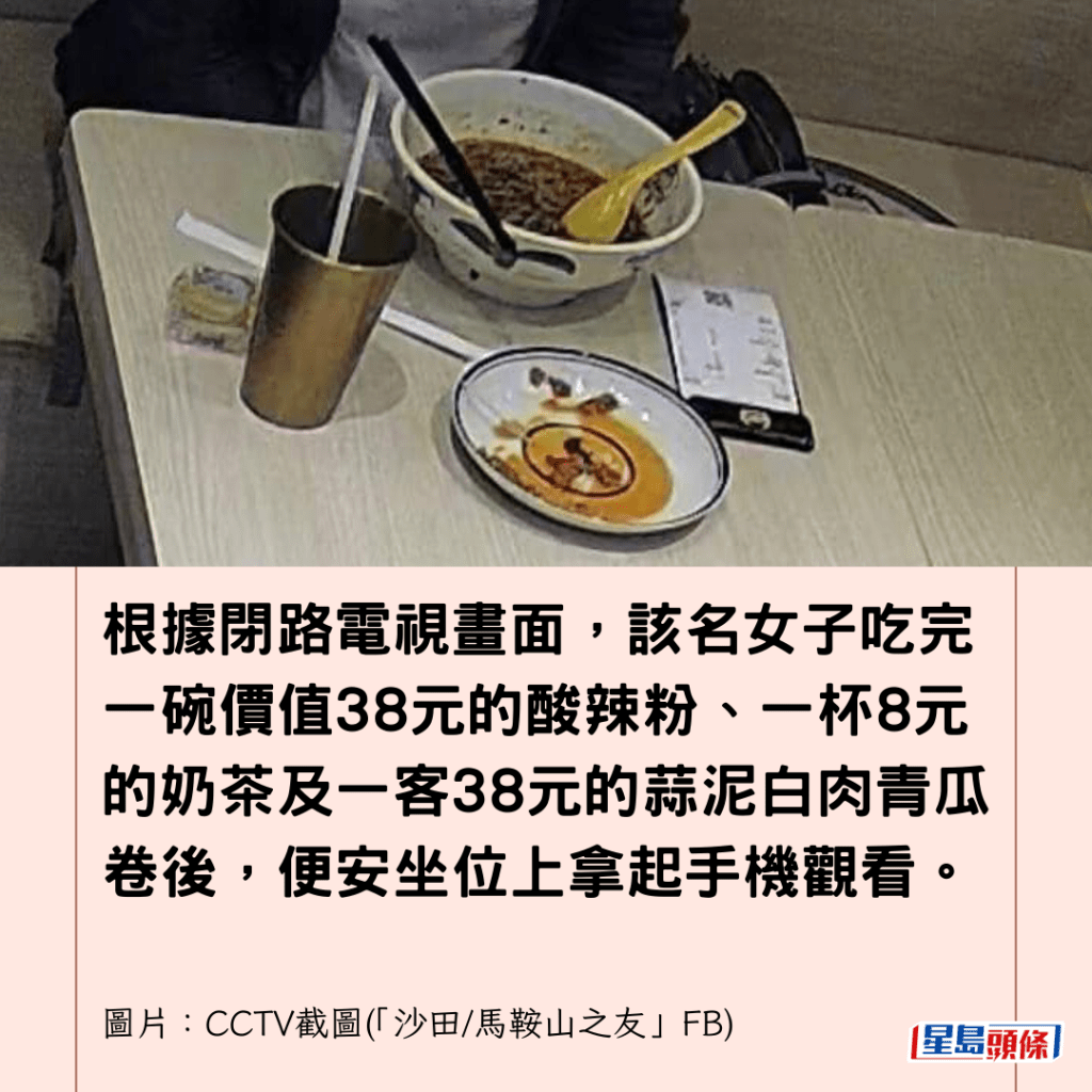 根據閉路電視畫面,該名女子吃完一碗價值38元的酸辣粉、一杯8元的奶茶及一客38元的蒜泥白肉青瓜卷後,便安坐位上拿起手機觀看。