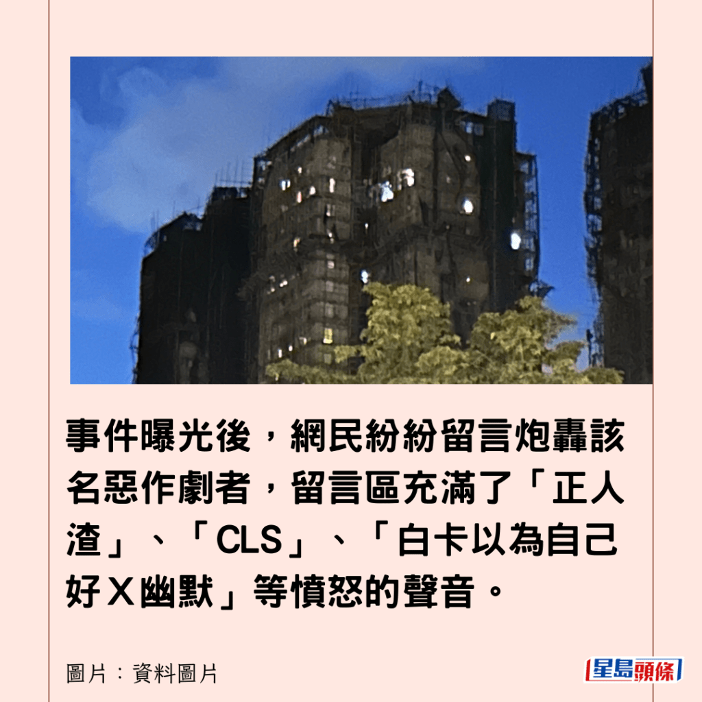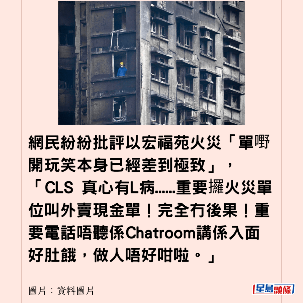網民紛紛批評以宏福苑火災「單嘢開玩笑本身已經差到極致」,「CLS 真心有L病……重要攞火災單位叫外賣現金單!完全冇後果!重要電話唔聽係Chatroom講係入面好肚餓,做人唔好咁啦。」