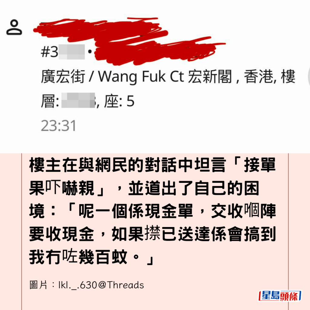 樓主在與網民的對話中坦言「接單果吓嚇親」,並道出了自己的困境:「呢一個係現金單,交收嗰陣要收現金,如果㩒已送達係會搞到我冇咗幾百蚊。」換言之,惡作劇者可能是看準了這一點,想讓外賣員進退兩難,白白浪費時間之餘,還可能要倒貼金錢。