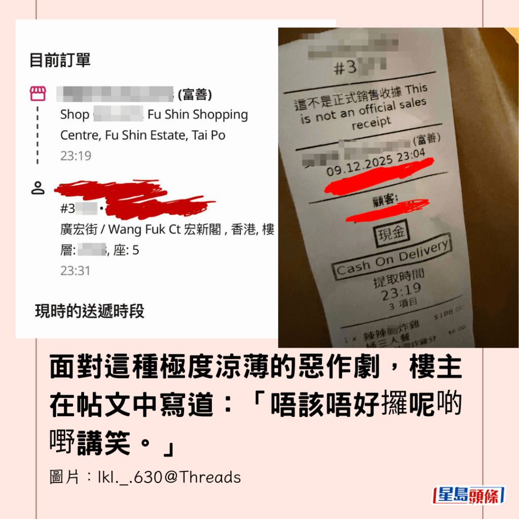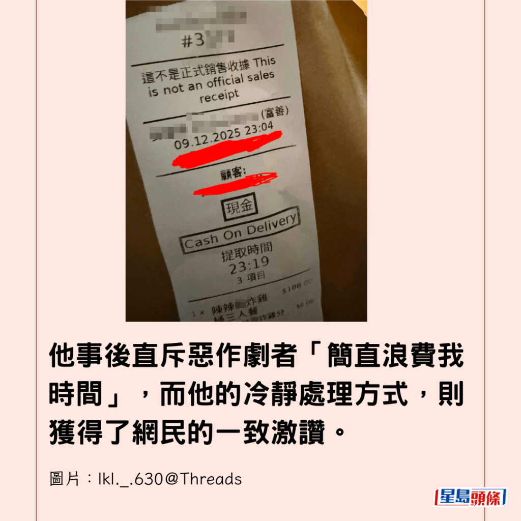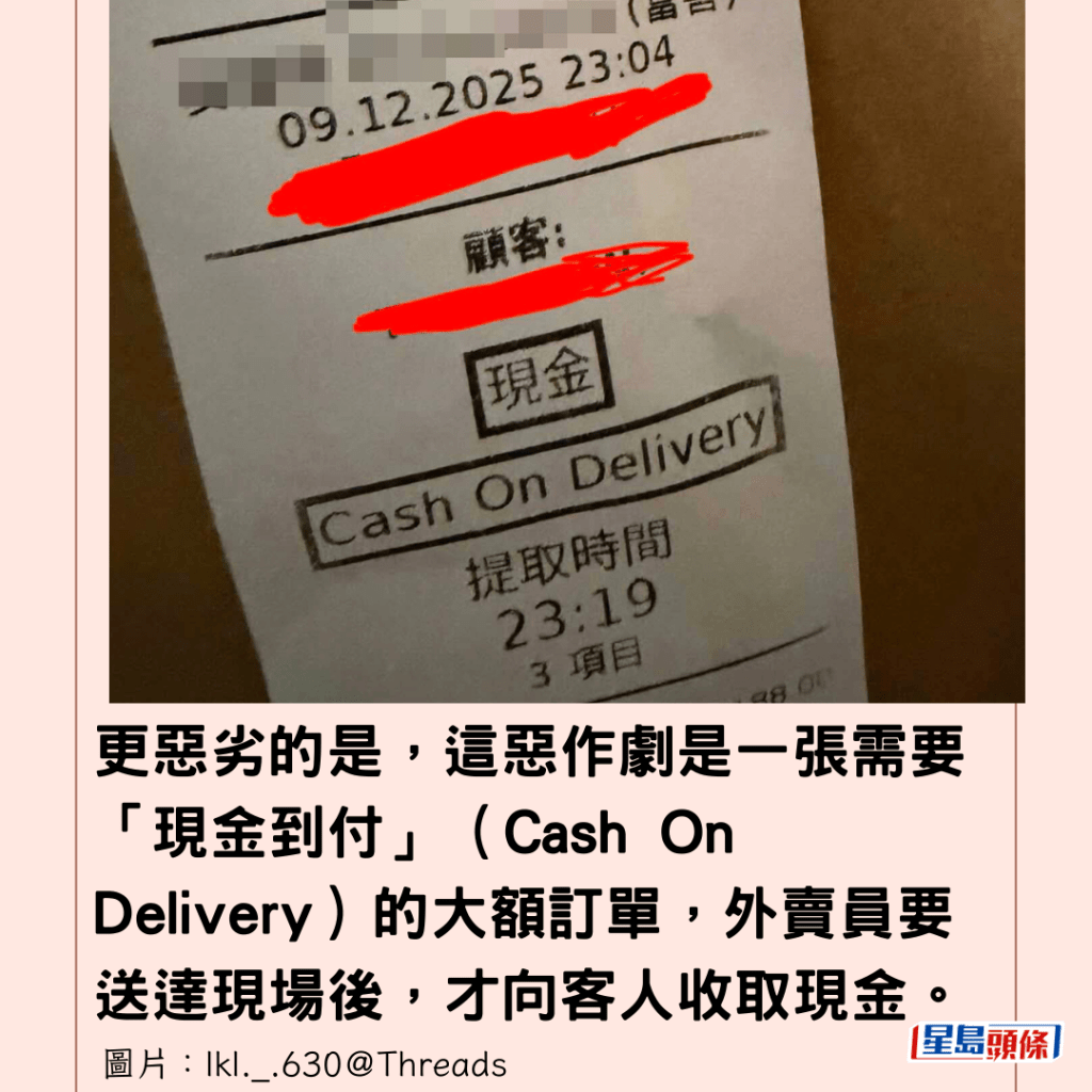 更惡劣的是,這惡作劇是一張需要「現金到付」(Cash On Delivery)的大額訂單,外賣員要送達現場後,才向客人收取現金。