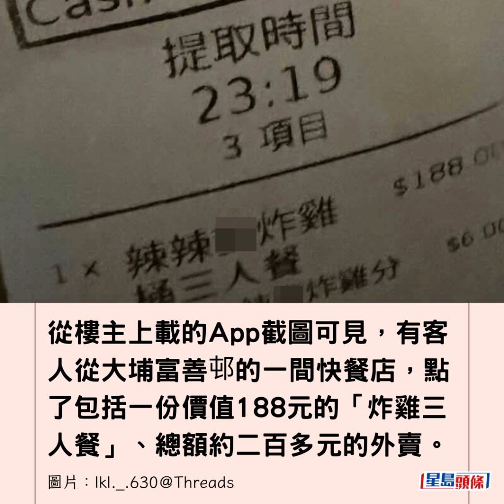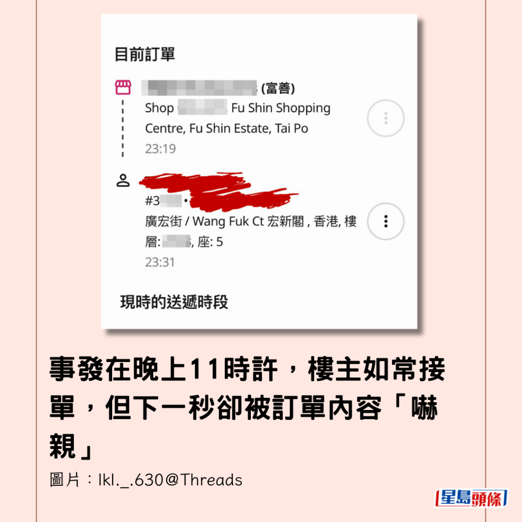 事發在昨晚11時許,樓主如常接單,但下一秒卻被訂單內容「嚇親」,從樓主上載的App截圖可見,有客人從大埔富善邨的一間快餐店,點了包括一份價值188元的「炸雞三人餐」、總額約二百多元的外賣。然而,最令人髮指的是,送餐地址竟直指早前發生致命火災的「宏福苑宏新閣」一個單位。