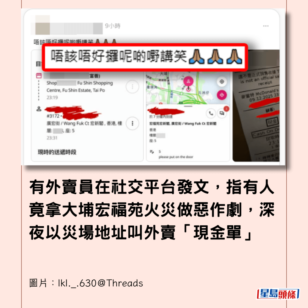 人神共憤!竟以宏福苑火災地址叫外賣 外賣員一招KO惡作劇「現金單」 結局大快人心↓↓↓↓