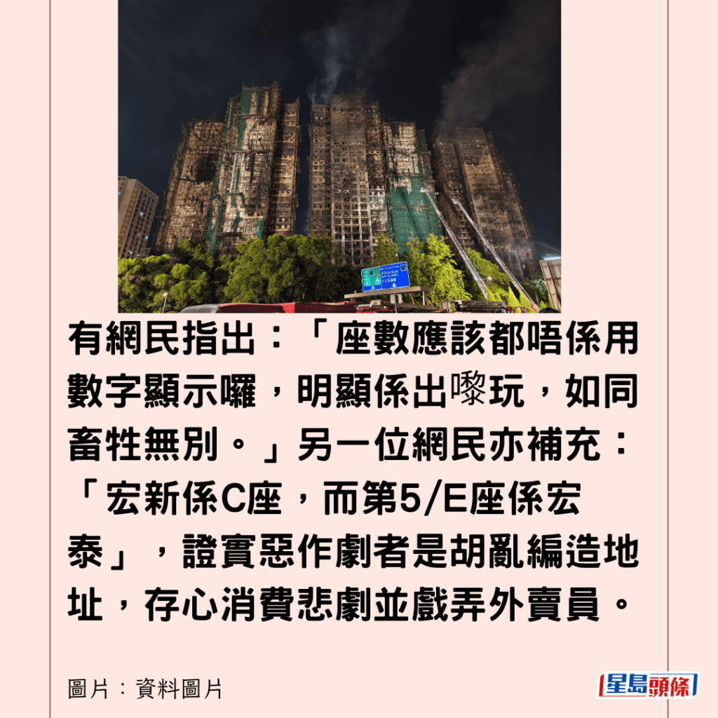 有網民指出:「座數應該都唔係用數字顯示囉,明顯係出嚟玩,如同畜牲無別。」另一位網民亦補充:「宏新係C座,而第5/E座係宏泰」,證實惡作劇者是胡亂編造地址,存心消費悲劇並戲弄外賣員。