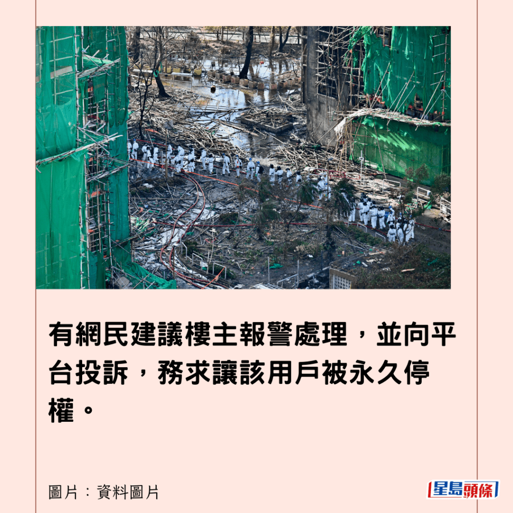 不少網民認為這種玩笑毫無底線、極不尊重死者,批評「呢d on9當有趣,完全當大埔火災當係笑話、0尊」、「做埋呢啲嘢會有報應」,有網民建議樓主報警處理,並向平台投訴,務求讓該用戶被永久停權。