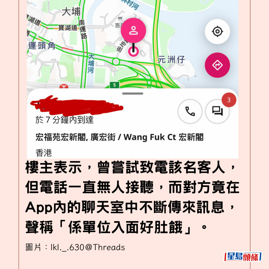 面對這種極度涼薄的惡作劇,樓主在帖文中寫道:「唔該唔好攞呢啲嘢講笑。」樓主表示,曾嘗試致電該名客人,但電話一直無人接聽,而對方竟在App內的聊天室中不斷傳來訊息,聲稱「係單位入面好肚餓」。