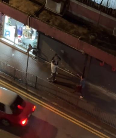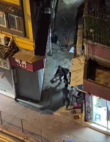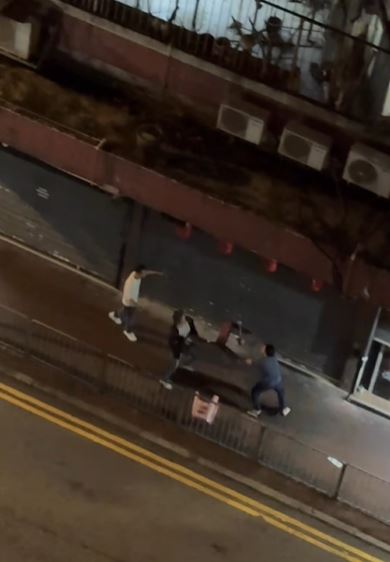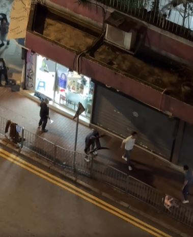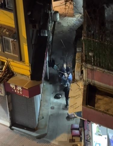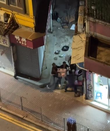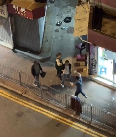 網上今日流傳兩條影片,拍下在長沙灣青山道晚上發生三男打鬥事件。片中顯示三名男子在後巷武鬥,一名藍衫男持鋸刀揮舞,另有兩名黑衫男向他掟枱凳,來勢洶洶,還有一名穿圍裙紮馬尾的女子在場,看到三男打鬥,不只沒有避開,更不時出手勸止,又大喝「唔好打」,被網民讚夠冷靜,膽色過人。