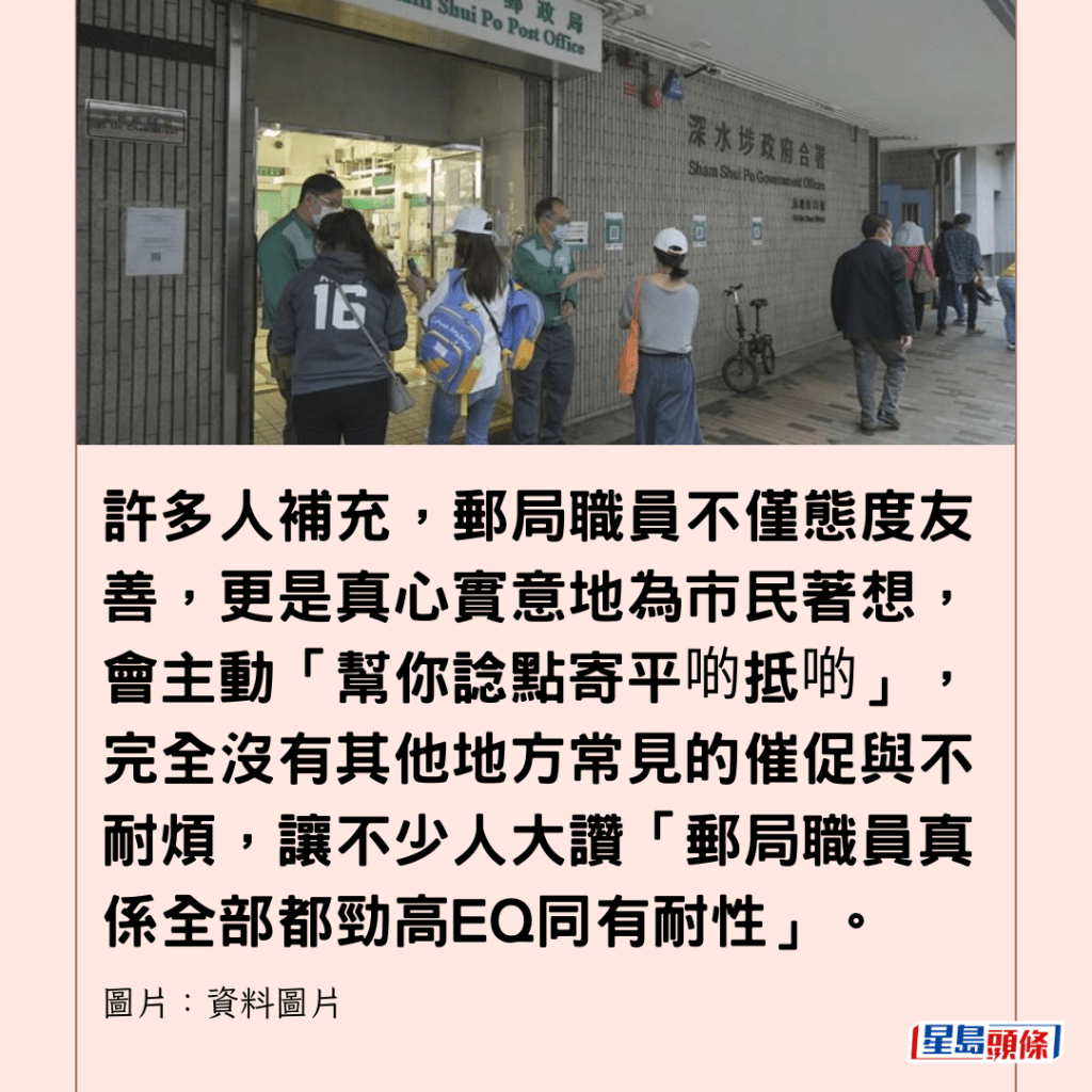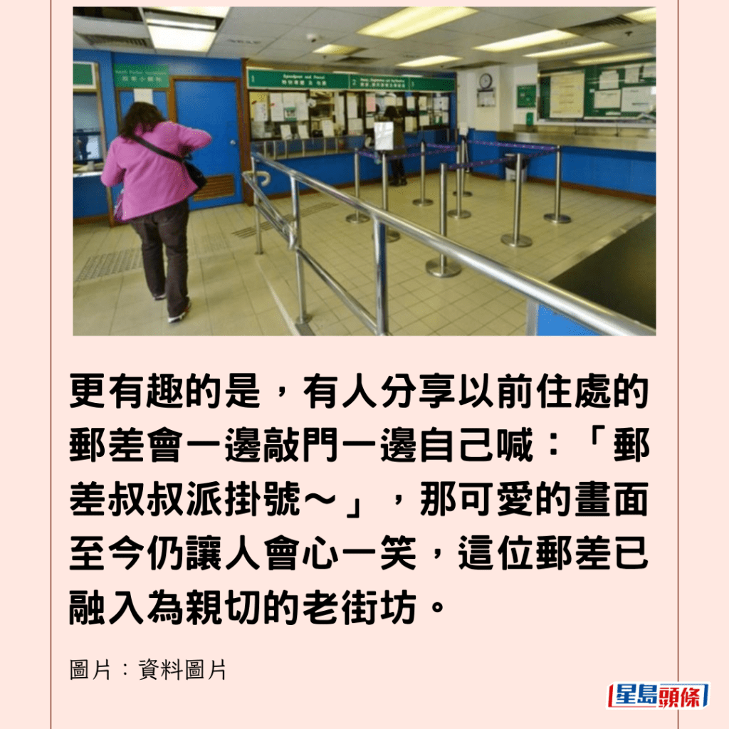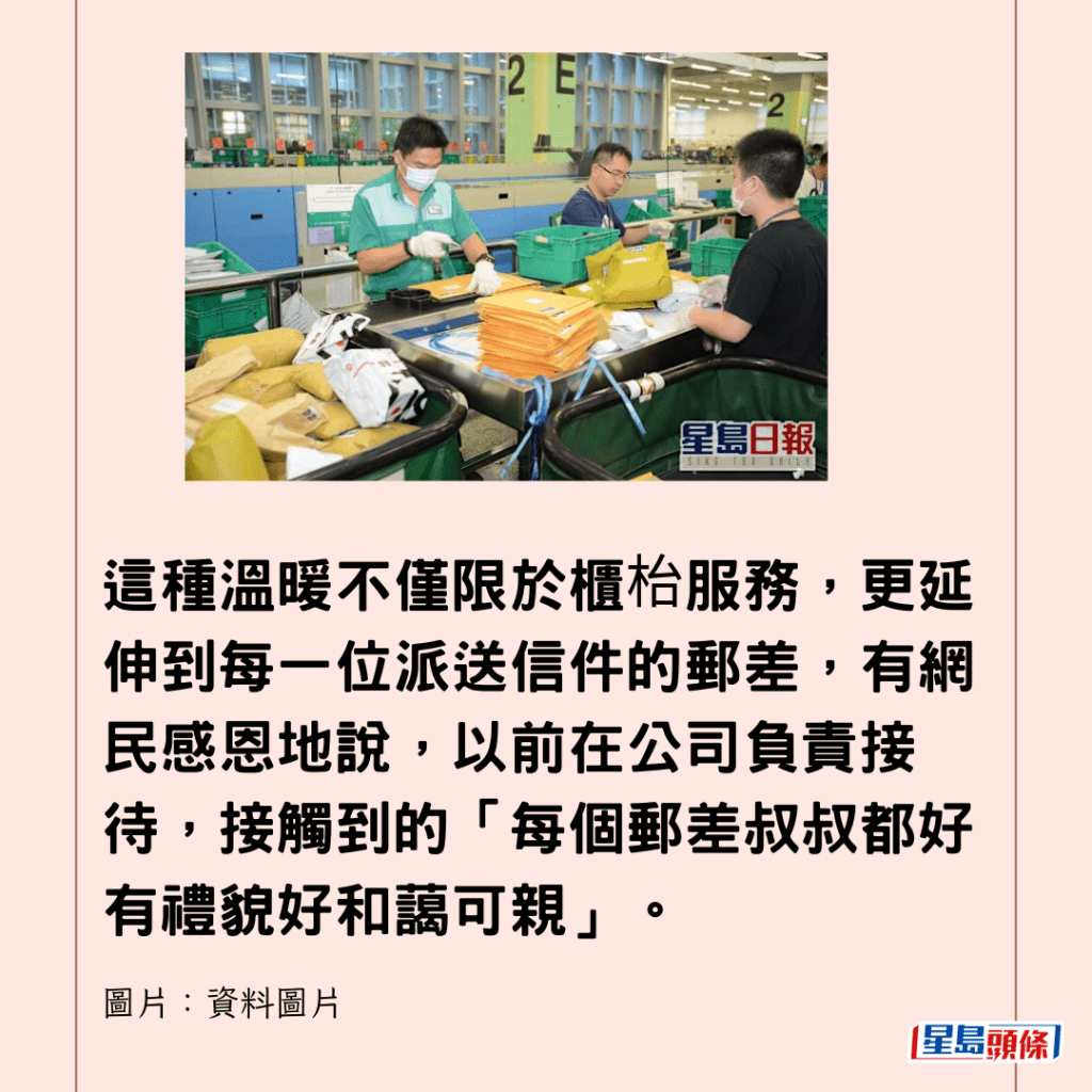 這種溫暖不僅限於櫃枱服務,更延伸到每一位派送信件的郵差,有網民感恩地說,以前在公司負責接待,接觸到的「每個郵差叔叔都好有禮貌好和藹可親」。