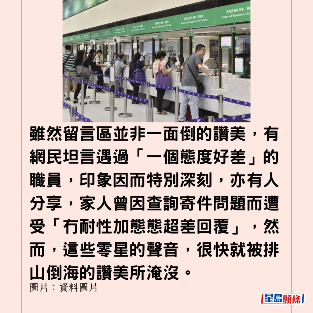 雖然留言區並非一面倒的讚美,有網民坦言遇過「一個態度好差」的職員,印象因而特別深刻,亦有人分享,家人曾因查詢寄件問題而遭受「冇耐性加態態超差回覆」,然而,這些零星的聲音,很快就被排山倒海的讚美所淹沒。