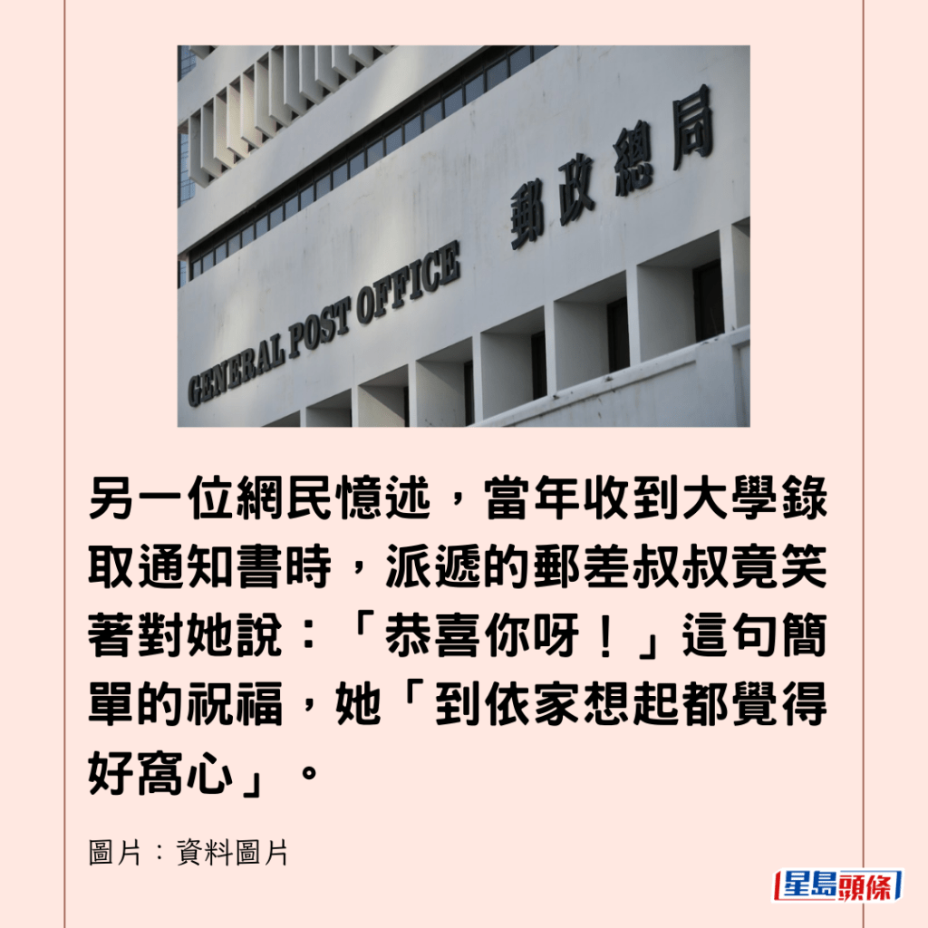 另一位網民憶述,當年收到大學錄取通知書時,派遞的郵差叔叔竟笑著對她說:「恭喜你呀!」這句簡單的祝福,她「到依家想起都覺得好窩心」。