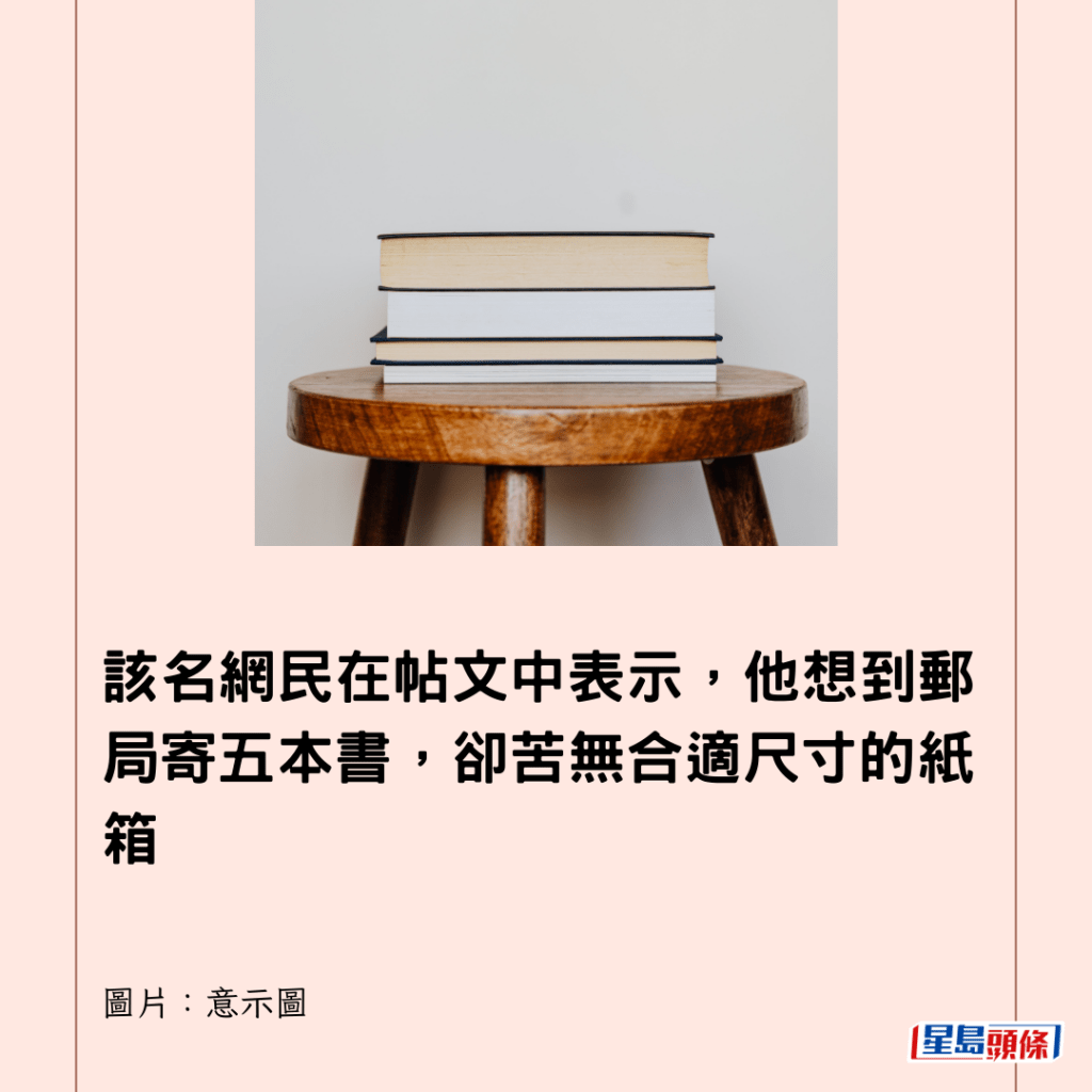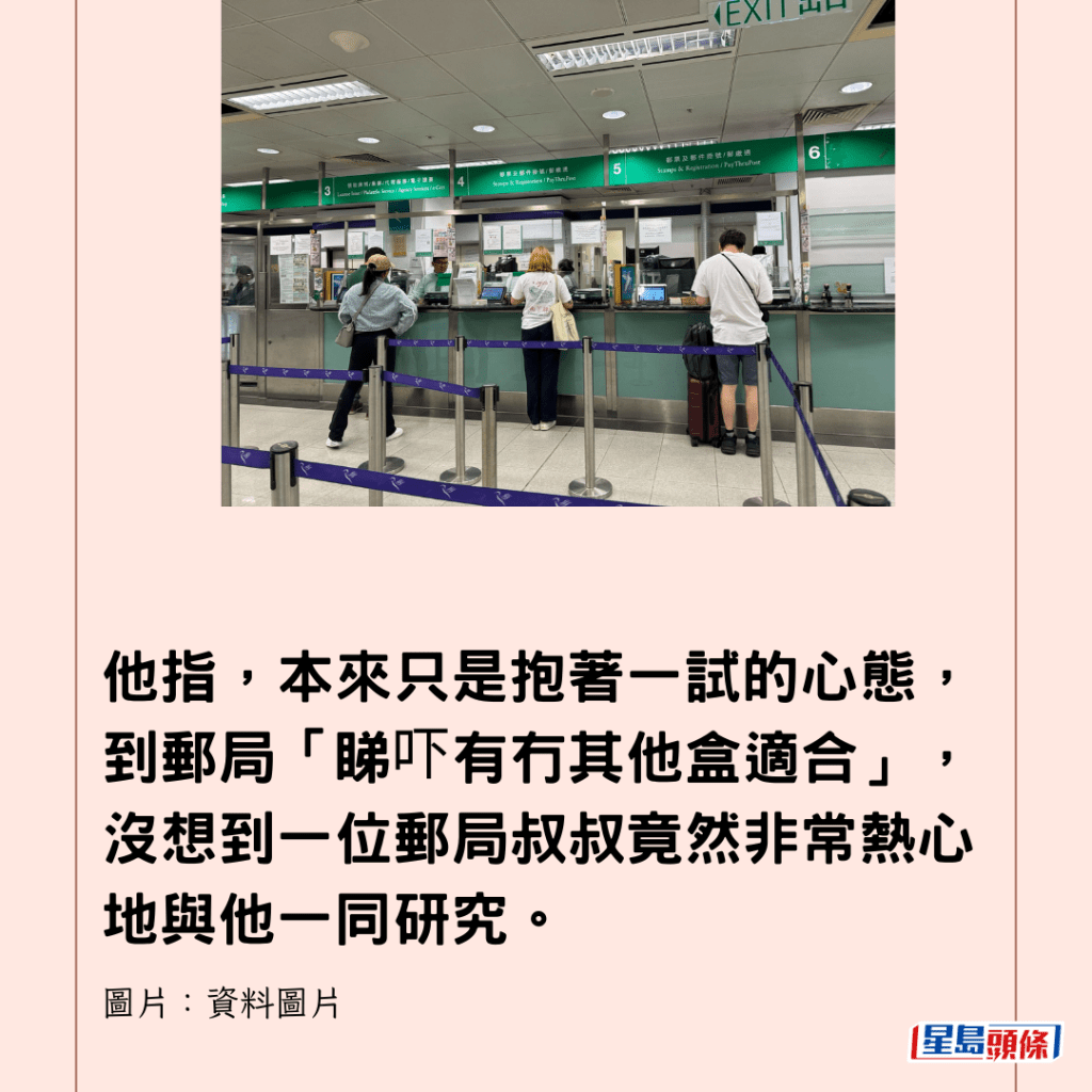 該名網民在帖文中表示,他想到郵局寄五本書,卻苦無合適尺寸的紙箱,他指,本來只是抱著一試的心態,到郵局「睇吓有冇其他盒適合」,沒想到一位郵局叔叔竟然非常熱心地與他一同研究。