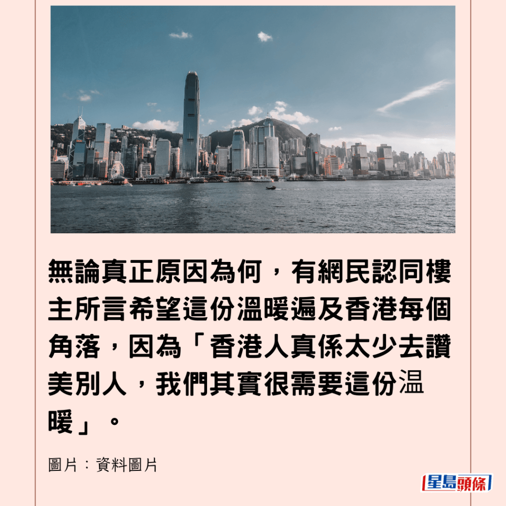 無論真正原因為何,有網民認同樓主所言希望這份溫暖遍及香港每個角落,因為「香港人真係太少去讚美別人,我們其實很需要這份温暖」。