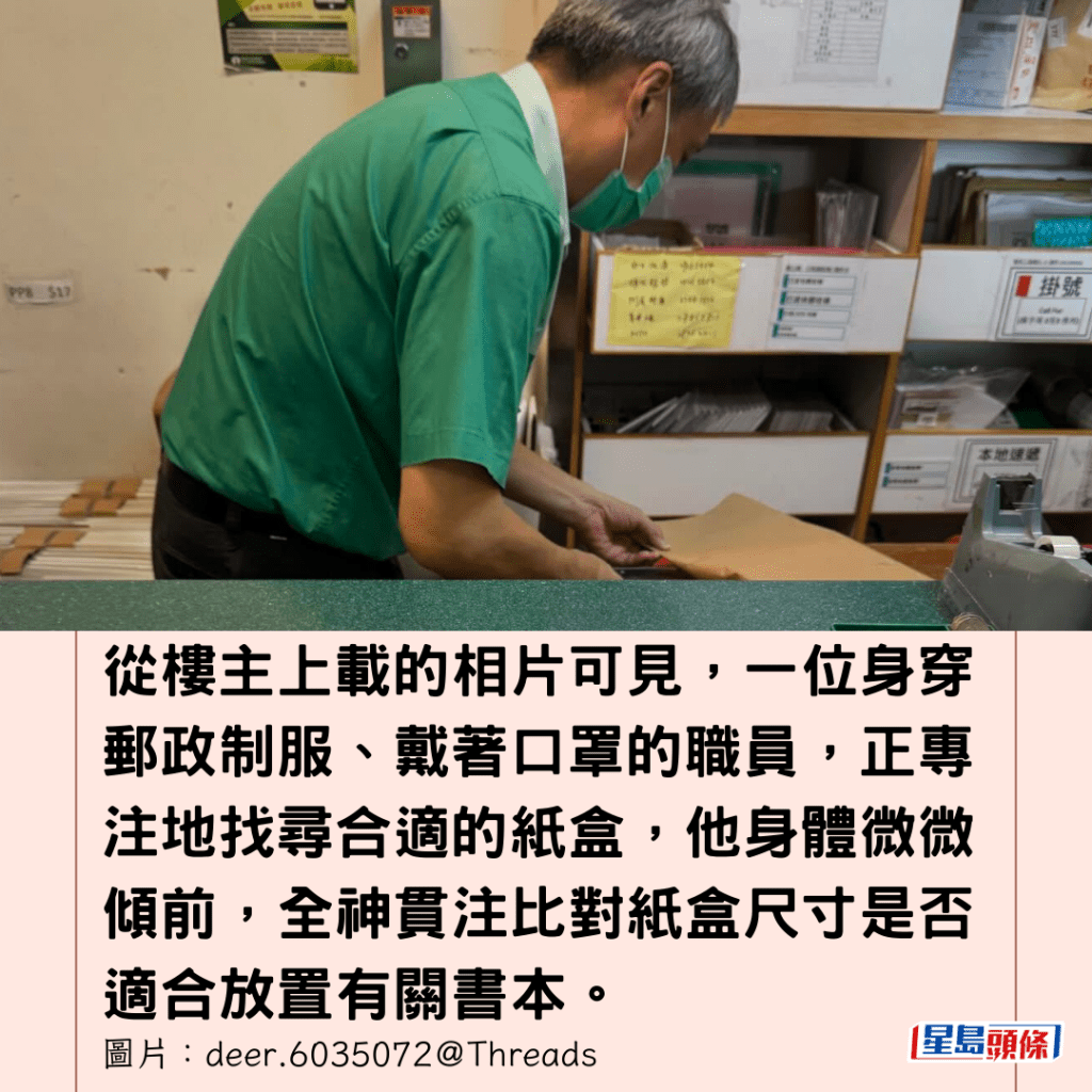 從樓主上載的相片可見,一位身穿郵政制服、戴著口罩的職員,正專注地找尋合適的紙盒,他身體微微傾前,全神貫注比對紙盒尺寸是否適合放置有關書本。