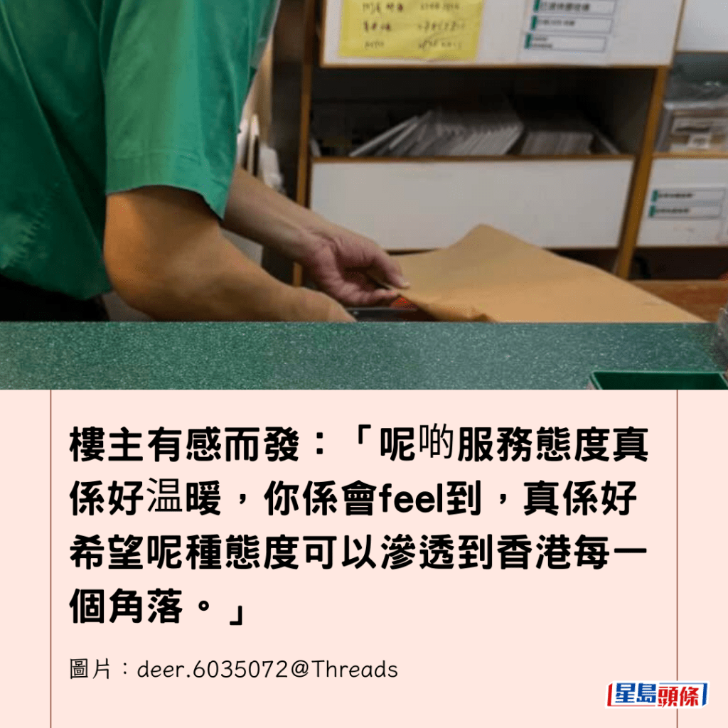 樓主有感而發:「呢啲服務態度真係好温暖,你係會feel到,真係好希望呢種態度可以滲透到香港每一個角落。」