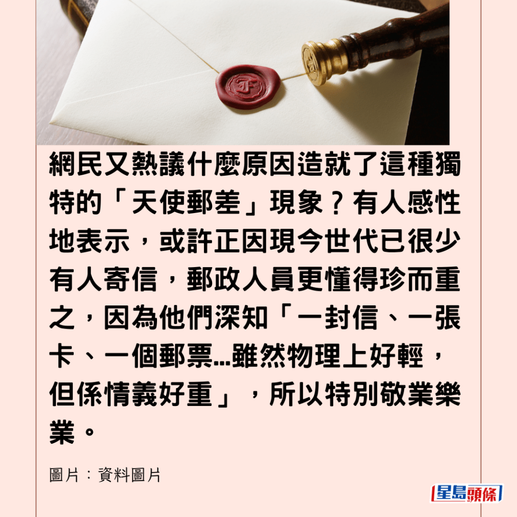 網民又熱議什麼原因造就了這種獨特的「天使郵差」現象?有人感性地表示,或許正因現今世代已很少有人寄信,郵政人員更懂得珍而重之,因為他們深知「一封信、一張卡、一個郵票…雖然物理上好輕,但係情義好重」,所以特別敬業樂業。