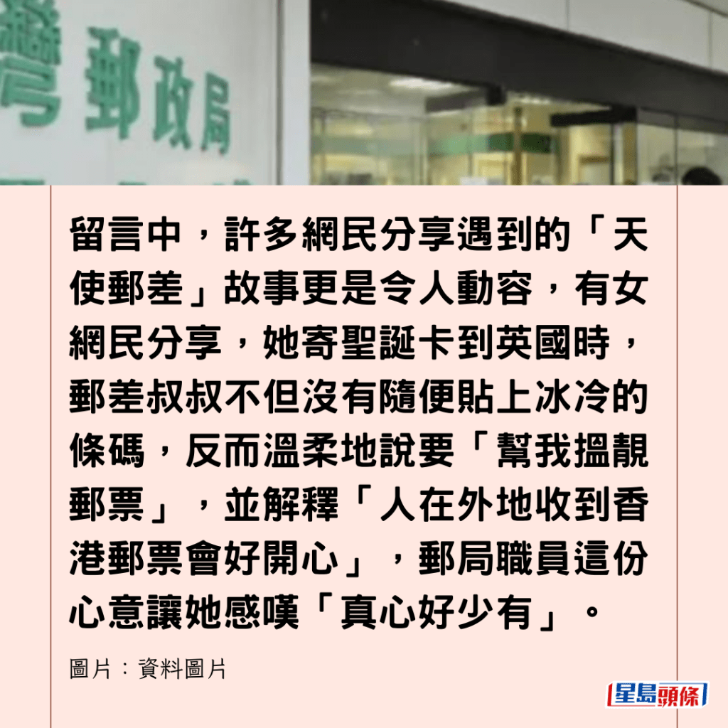 留言中,許多網民分享遇到的「天使郵差」故事更是令人動容,有女網民分享,她寄聖誕卡到英國時,郵差叔叔不但沒有隨便貼上冰冷的條碼,反而溫柔地說要「幫我搵靚郵票」,並解釋「人在外地收到香港郵票會好開心」,郵局職員這份心意讓她感嘆「真心好少有」。
