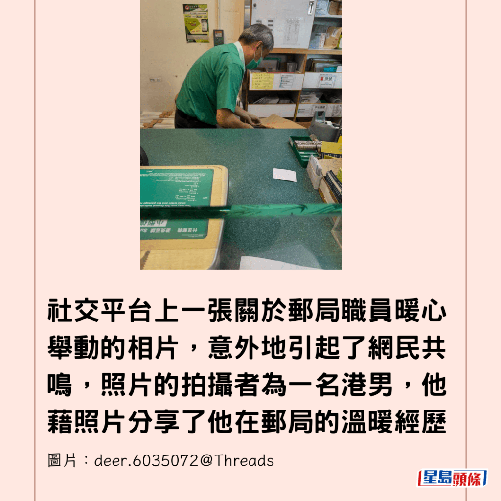社交平台上一張關於郵局職員暖心舉動的相片,意外地引起了網民共鳴,照片的拍攝者為一名港男,他藉照片分享了他在郵局的溫暖經歷,大讚郵局是「全香港最溫柔最有禮貌嘅地方」,觸動了無數網民的心,紛紛留言分享自己遇到「天使郵差」的窩心故事。