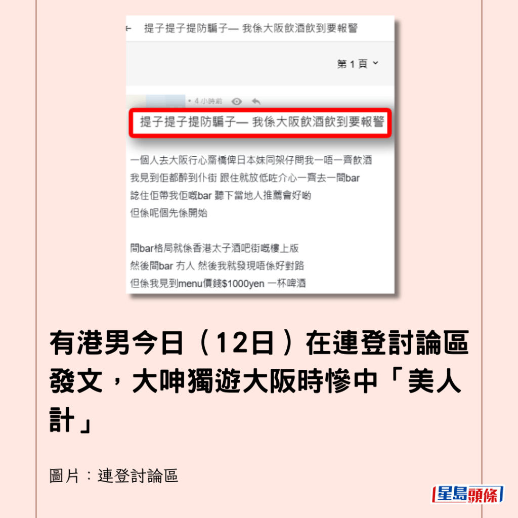 有港男今日(12日)在連登討論區發文,大呻獨遊大阪時慘中「美人計」,被日本男女搭訕邀請飲酒,結果墮入遊客陷阱,兩杯啤酒竟被索價6萬円(約3001港元),最後更要報警求助,但日本警察的處理手法,卻令他大感無奈和憤怒,直呼「好X柒bad trip」。