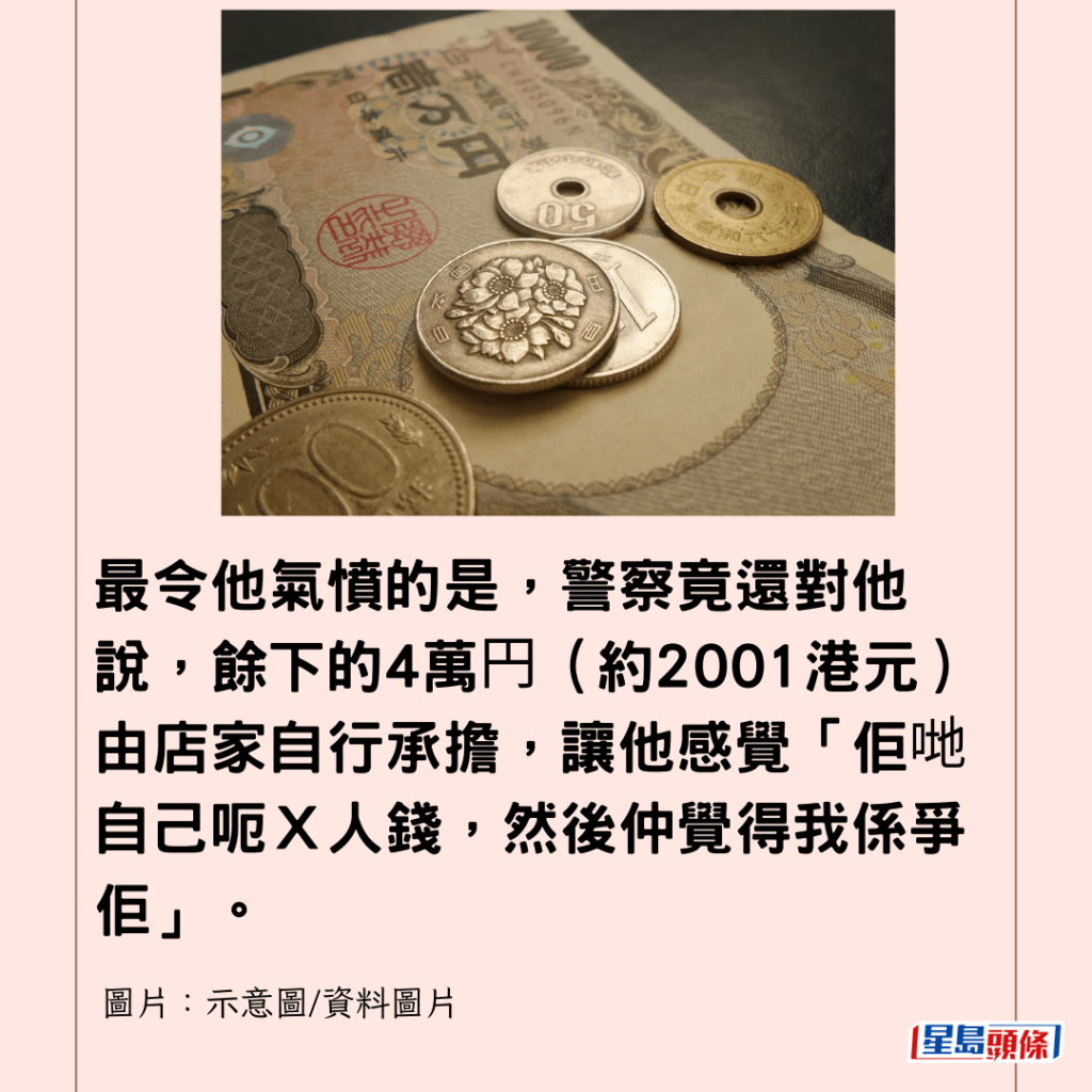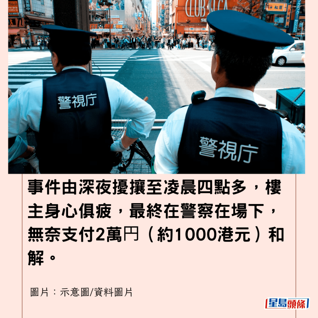 事件由深夜擾攘至凌晨四點多,樓主身心俱疲,最終在警察在場下,無奈支付2萬円(約1000港元)和解。最令他氣憤的是,警察竟還對他說,餘下的4萬円(約2001港元)由店家自行承擔,讓他感覺「佢哋自己呃X人錢,然後仲覺得我係爭佢」。