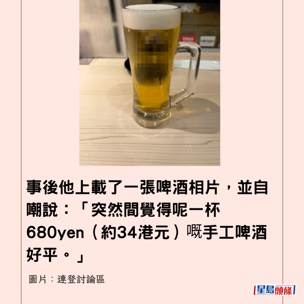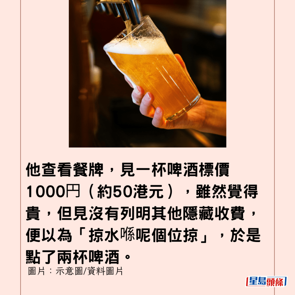 他查看餐牌,見一杯啤酒標價1000円(約50港元),雖然覺得貴,但見沒有列明其他隱藏收費,便以為「掠水喺呢個位掠」,於是點了兩杯啤酒。