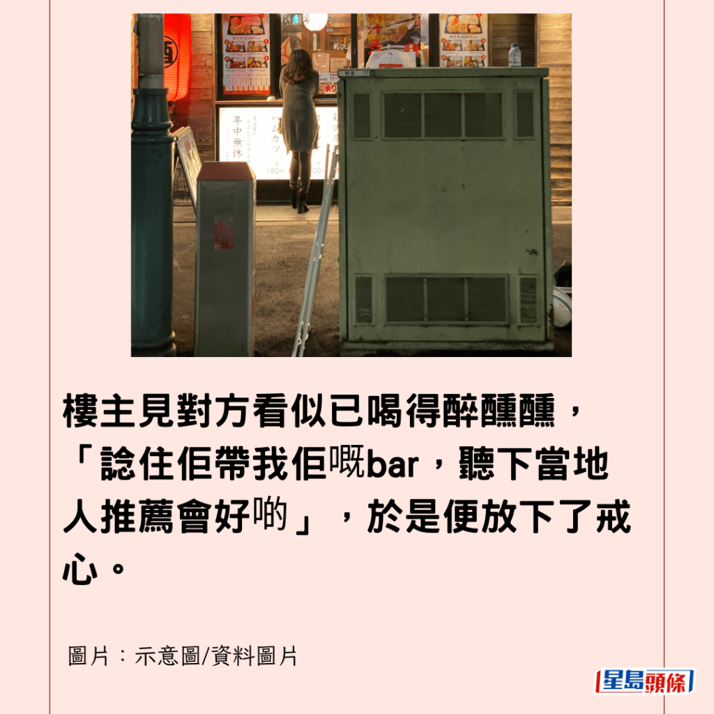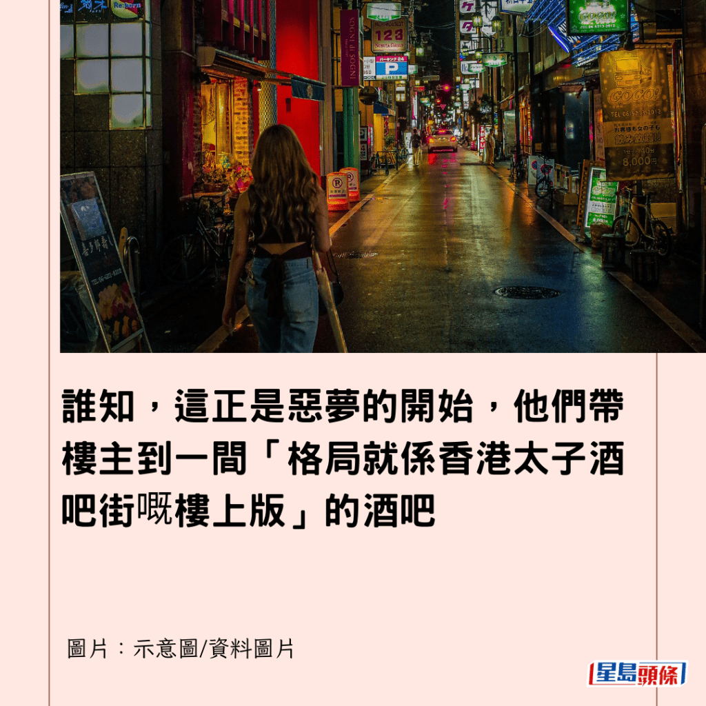 誰知,這正是惡夢的開始,他們帶樓主到一間「格局就係香港太子酒吧街嘅樓上版」的酒吧,店內一個客人也沒有,樓主已心知不妙。