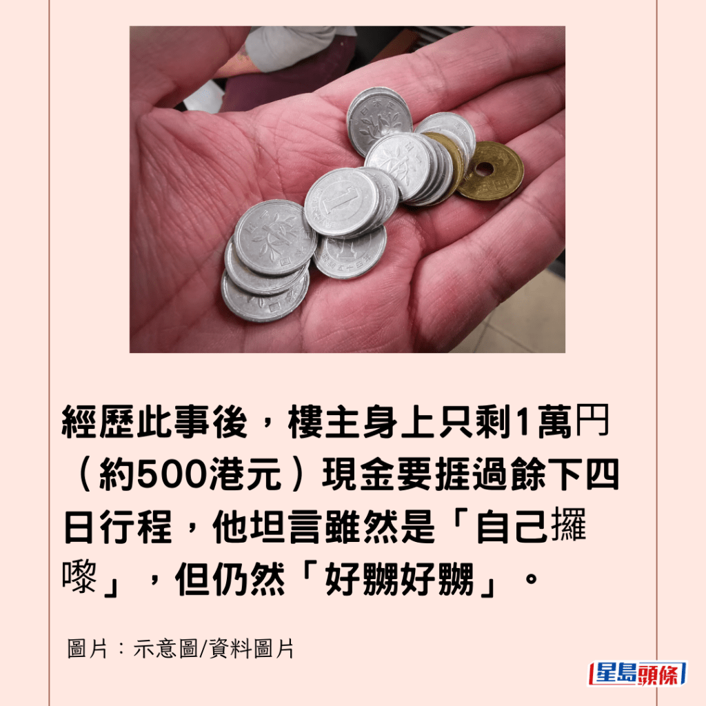 經歷此事後,樓主身上只剩1萬円(約500港元)現金要捱過餘下四日行程,他坦言雖然是「自己攞嚟」,但仍然「好嬲好嬲」。事後他上載了一張啤酒相片,並自嘲說:「突然間覺得呢一杯680yen(約34港元)嘅手工啤酒好平。」