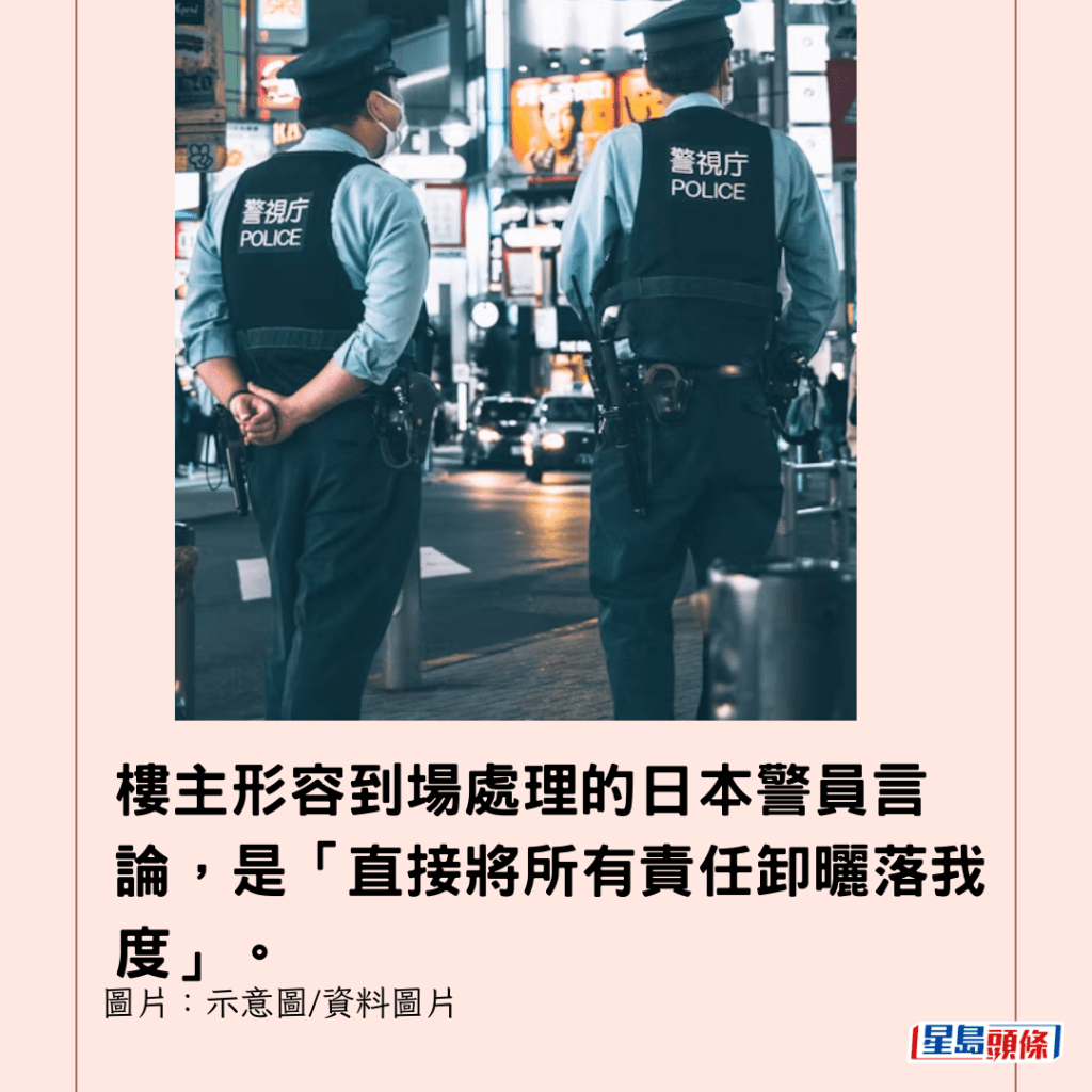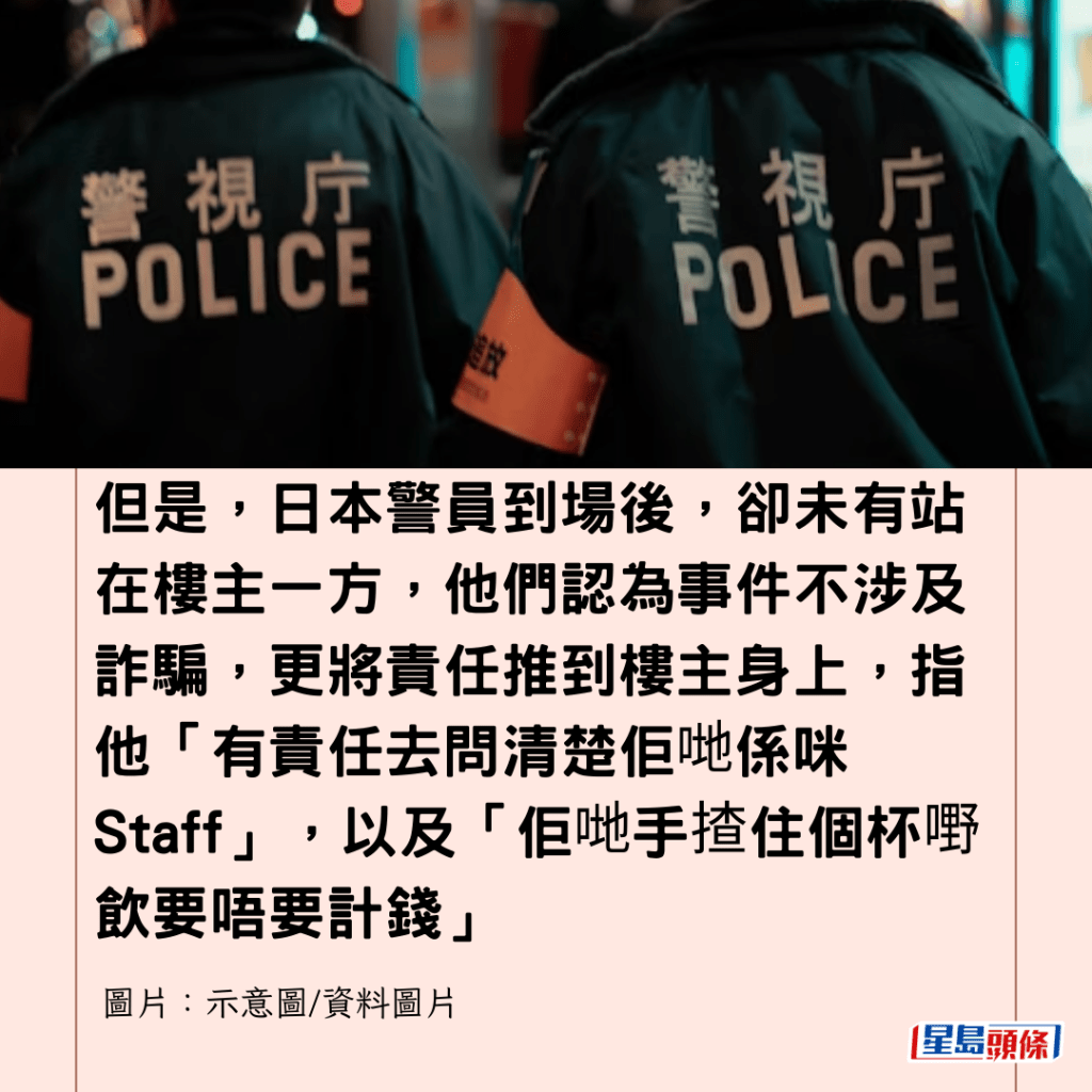 但是,日本警員到場後,卻未有站在樓主一方,他們認為事件不涉及詐騙,更將責任推到樓主身上,指他「有責任去問清楚佢哋係咪Staff」,以及「佢哋手揸住個杯嘢飲要唔要計錢」,樓主形容到場處理的日本警員言論,是「直接將所有責任卸曬落我度」。