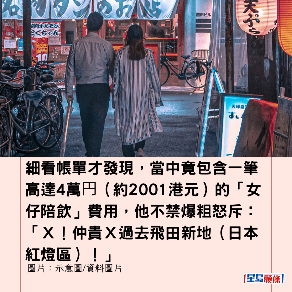 豈料埋單時,店員竟遞上一張6萬円(約3001港元)的帳單!樓主心想「wtf」,細看帳單才發現,當中竟包含一筆高達4萬円(約2001港元)的「女仔陪飲」費用,他不禁爆粗怒斥:「X!仲貴X過去飛田新地(日本紅燈區)!」