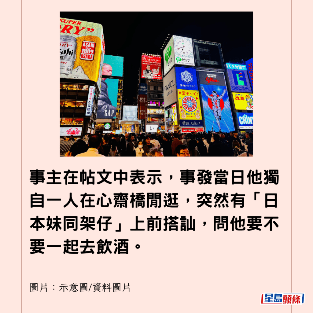 事主在帖文中表示,事發當日他獨自一人在心齋橋閒逛,突然有「日本妹同架仔」上前搭訕,問他要不要一起去飲酒。樓主見對方看似已喝得醉醺醺,「諗住佢帶我佢嘅bar,聽下當地人推薦會好啲」,於是便放下了戒心。