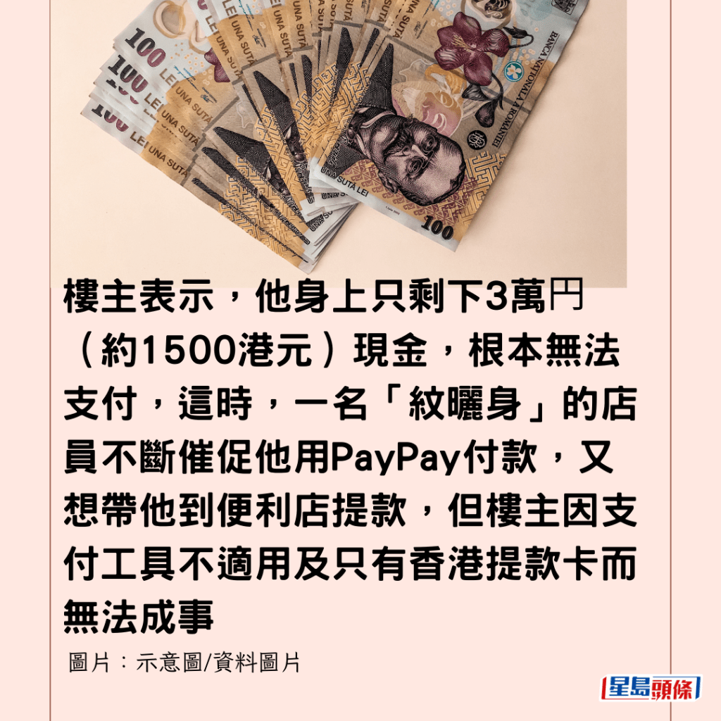 樓主表示,他身上只剩下3萬円(約1500港元)現金,根本無法支付,這時,一名「紋曬身」的店員不斷催促他用PayPay付款,又想帶他到便利店提款,但樓主因支付工具不適用及只有香港提款卡而無法成事,在無計可施下,樓主決定報警。