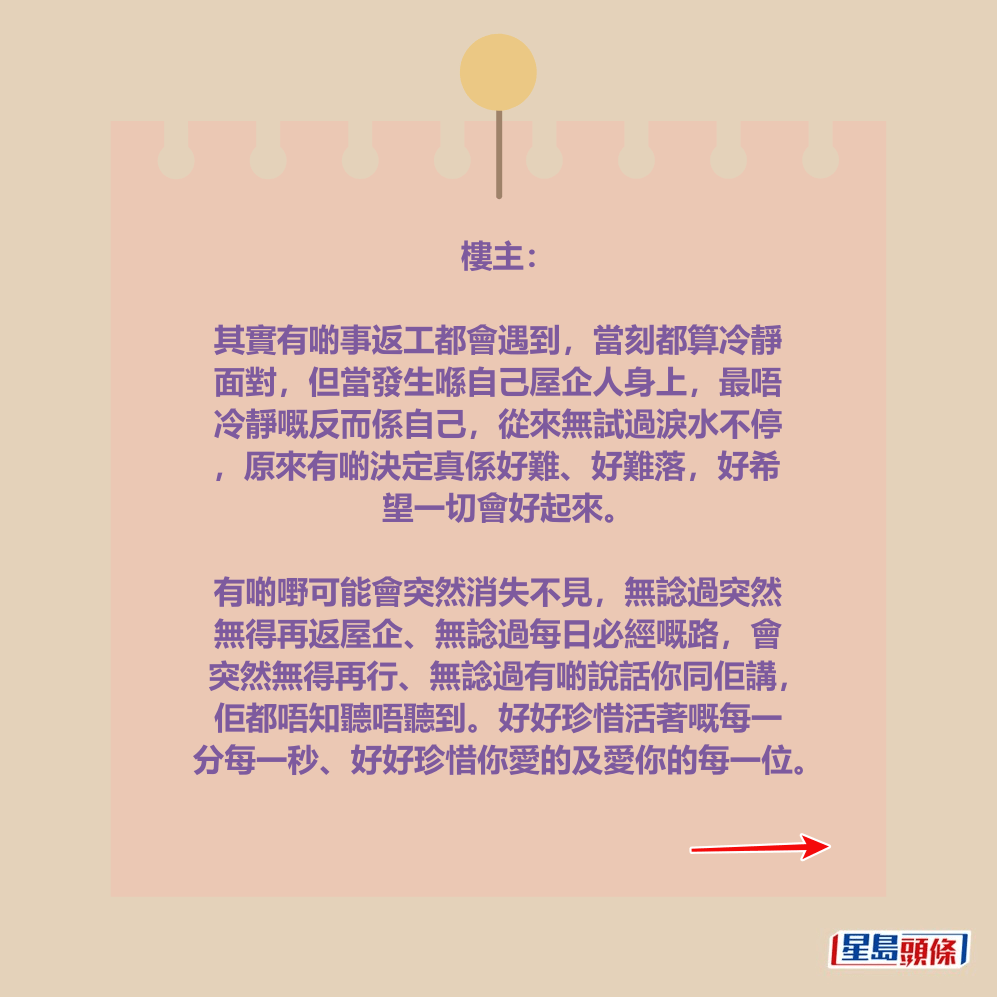 萬千感慨的樓主表示「有啲嘢可能會突然消失不見,無諗過突然無得再返屋企、無諗過每日必經嘅路,會突然無得再行、無諗過有啲說話你同佢講, 佢都唔知聽唔聽到。好好珍惜活著嘅每一分每一秒、好好珍惜你愛的及愛你的每一位」。