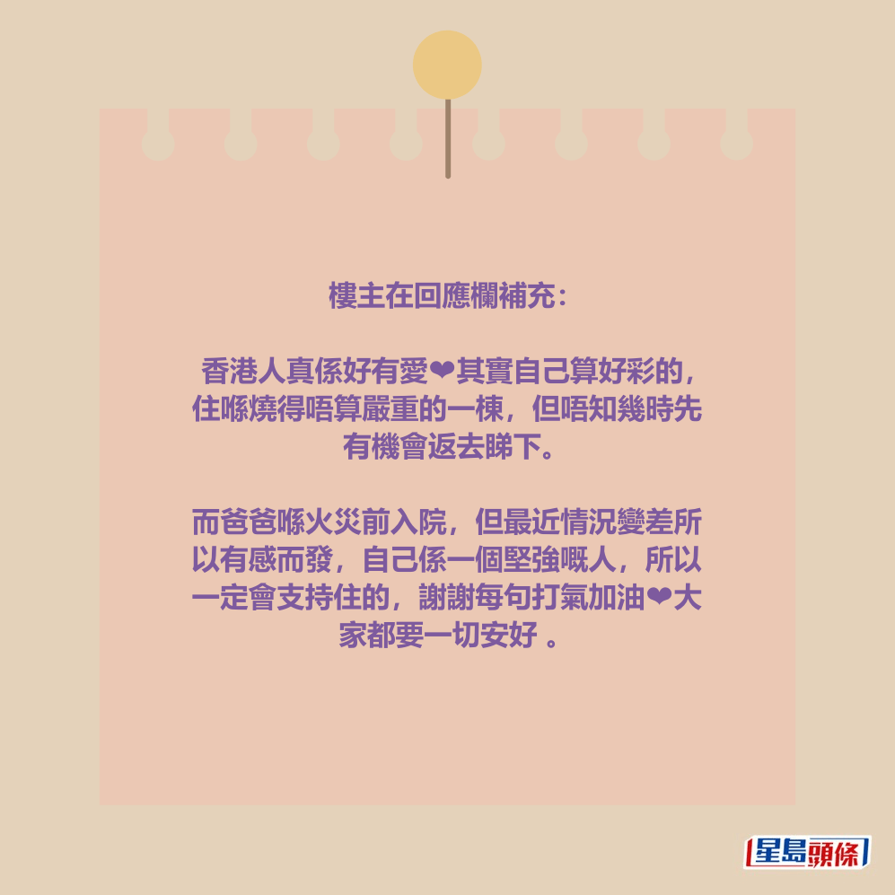 樓主在回應欄補充「香港人真係好有愛❤️其實自己算好彩的,住喺燒得唔算嚴重的一棟,但唔知幾時先有機會返去睇下,而爸爸喺火災前入院,但最近情況變差所以有感而發,自己係一個堅強嘅人,所以一定會支持住的,謝謝每句打氣加油❤️大家都要一切安好 」。