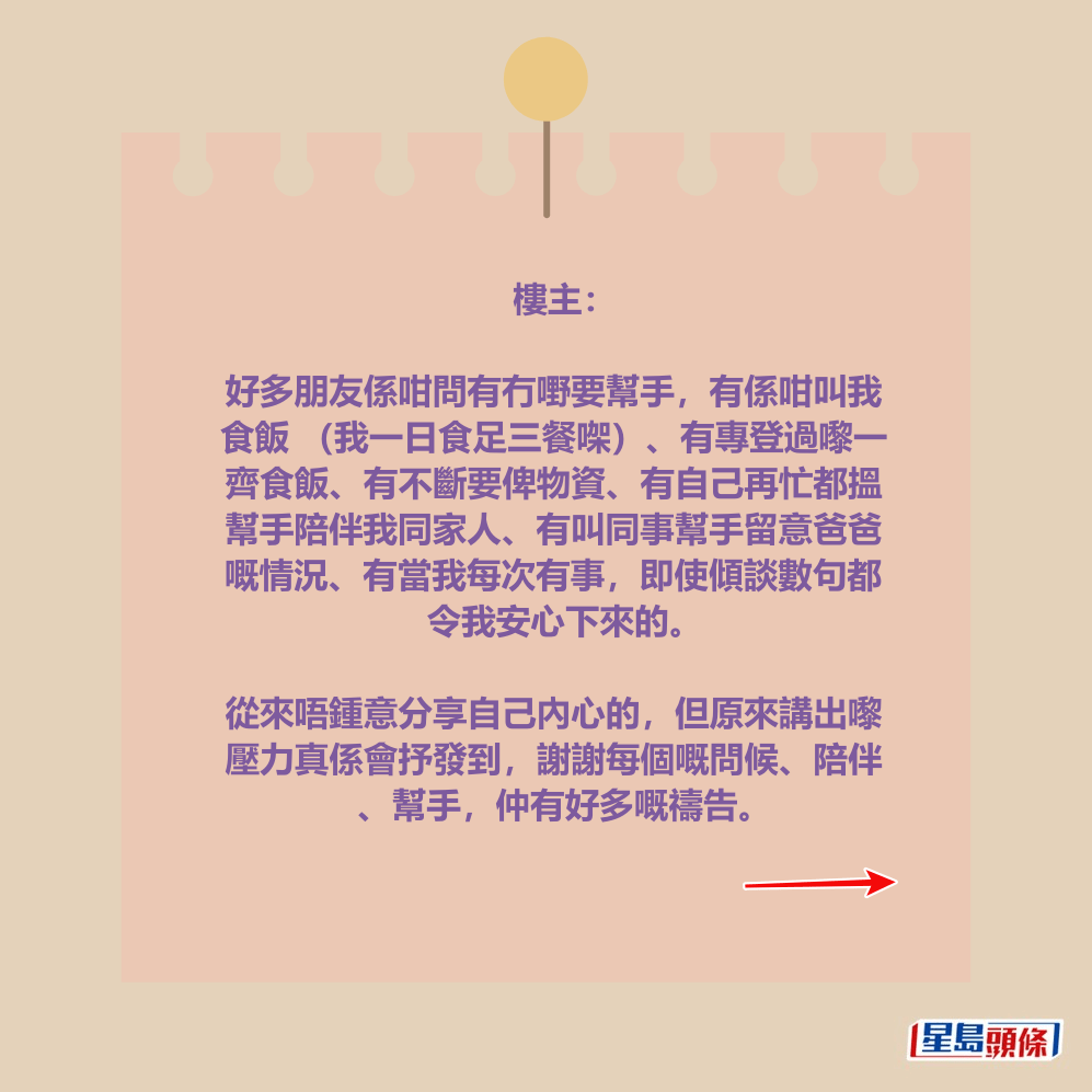 樓主續稱「無試過短短時間受到咁多衝擊,擔心記掛的事仍有一堆堆,但知道生活總要慢慢重回軌道,感受到身邊滿滿嘅愛,好多朋友係咁問有冇嘢要幫手,有係咁叫我食飯 (我一日食足三餐㗎)、有專登過嚟一齊食飯、有不斷要俾物資、有自己再忙都搵幫手陪伴我同家人、有叫同事幫手留意爸爸嘅情況、有當我每次有事,即使傾談數句都令我安心下來的」。