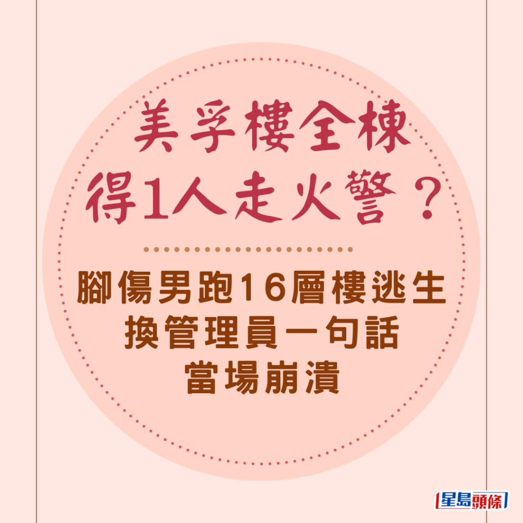 美孚樓全棟得1人走火警?腳傷男跑16層樓逃生 換管理員一句話當場崩潰↓↓↓↓