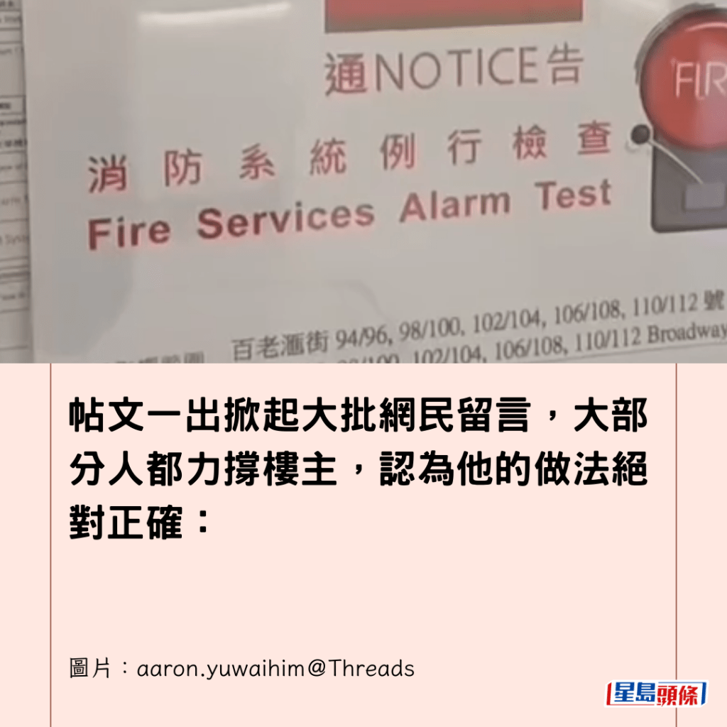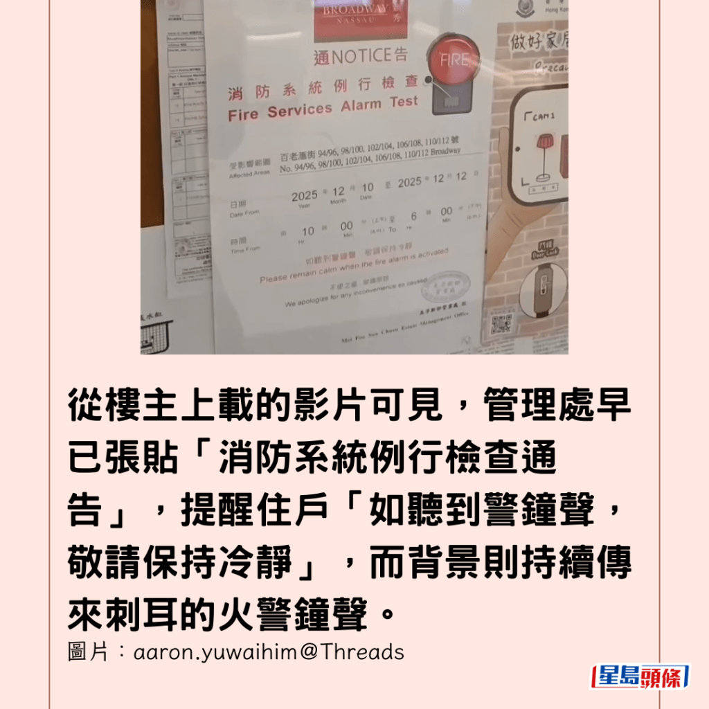 從樓主上載的影片可見,管理處早已張貼「消防系統例行檢查通告」,提醒住戶「如聽到警鐘聲,敬請保持冷靜」,而背景則持續傳來刺耳的火警鐘聲。