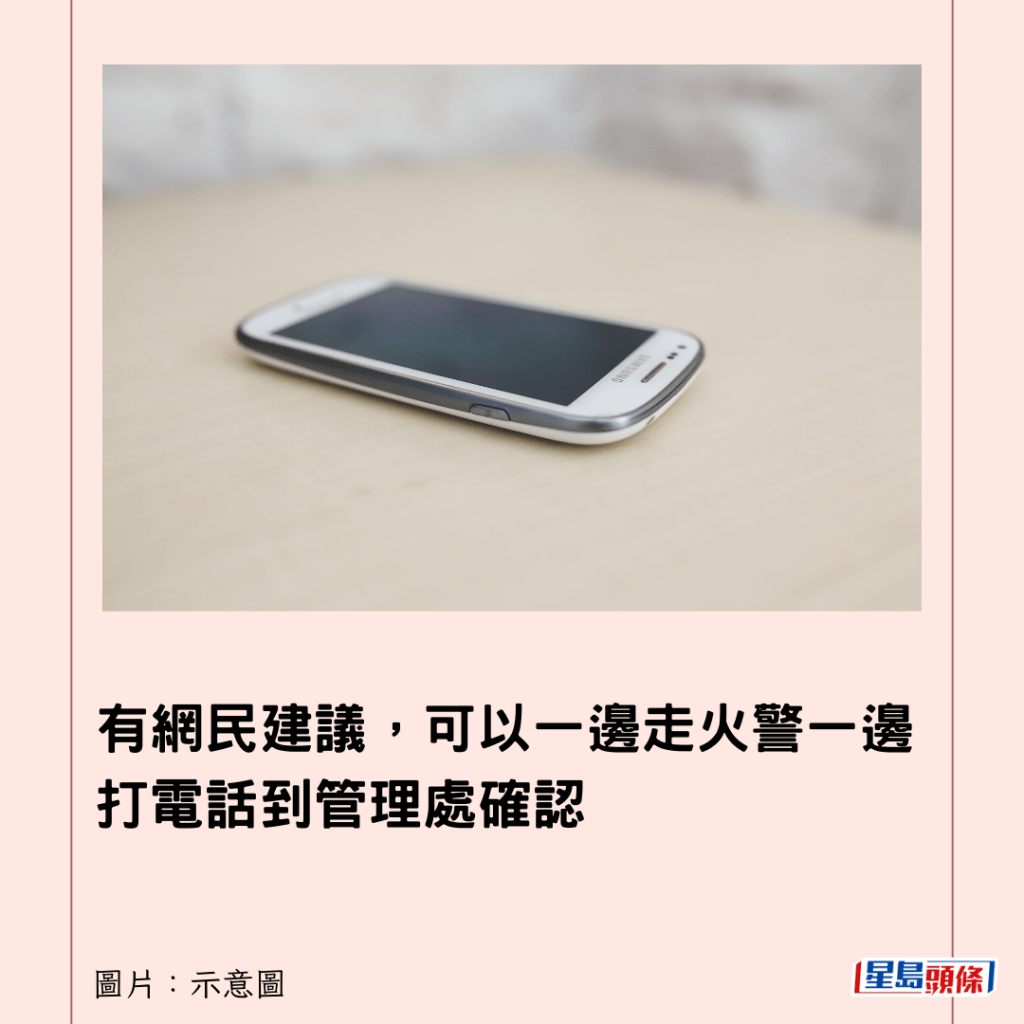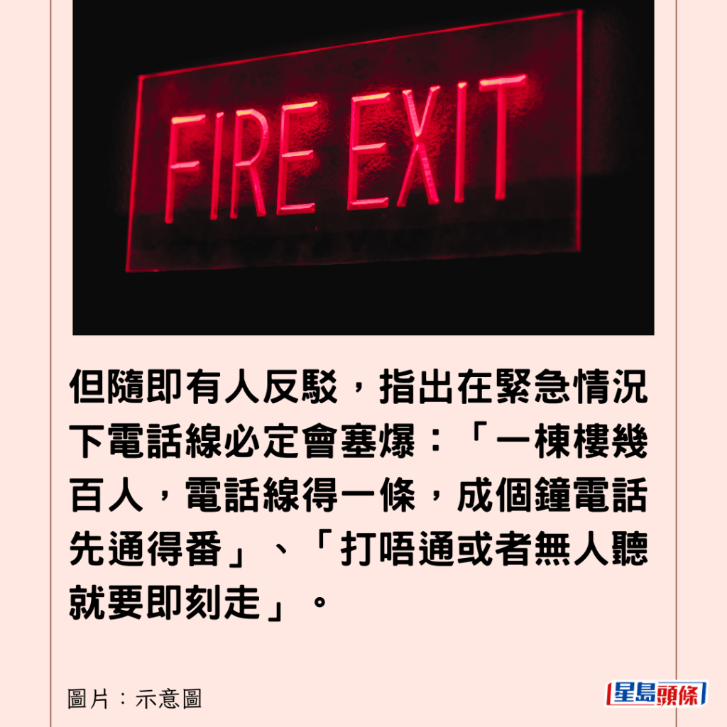 有網民建議,可以一邊走火警一邊打電話到管理處確認,但隨即有人反駁,指出在緊急情況下電話線必定會塞爆:「一棟樓幾百人,電話線得一條,成個鐘電話先通得番」、「打唔通或者無人聽就要即刻走」。